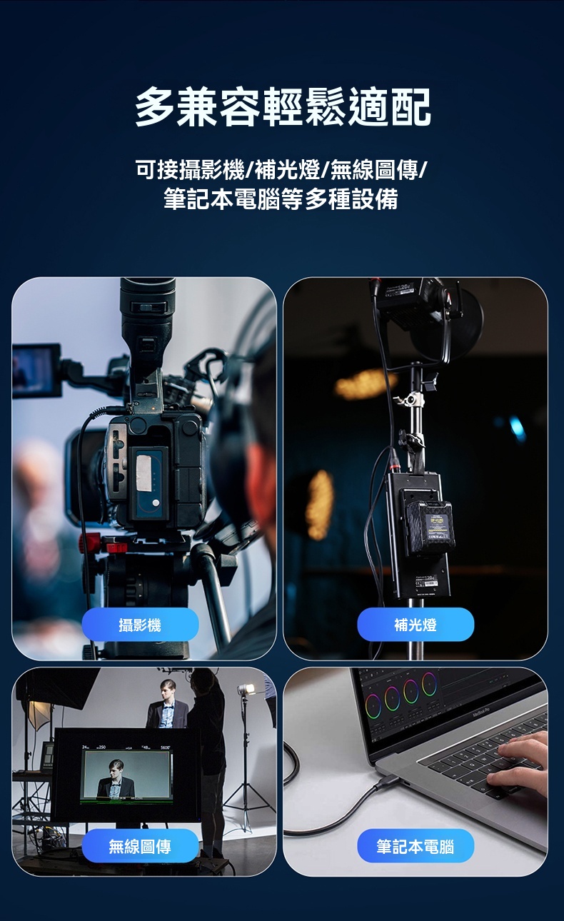 • 兼容多種設備,如攝影機、補光燈、無線圖傳、筆記本電腦等
