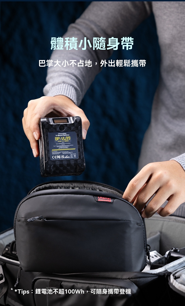 Ulanzi BP-VL99 V口攝影機行動電源,專為攝影愛好者打造。它容量高達26000mAh,能為攝影機持續供電,輕鬆滿足長時間拍攝需求。採用V口設計,安裝便捷,穩固不晃動。支援15W PD輸出,可為多種裝置快速充電。外殼堅固耐用,能有效抵禦日常碰撞刮傷。無論是戶外採風,還是室內創作,這款行動電源都能成為你的得力供電夥伴,讓你告別電量焦慮,專注捕捉精彩瞬間 。