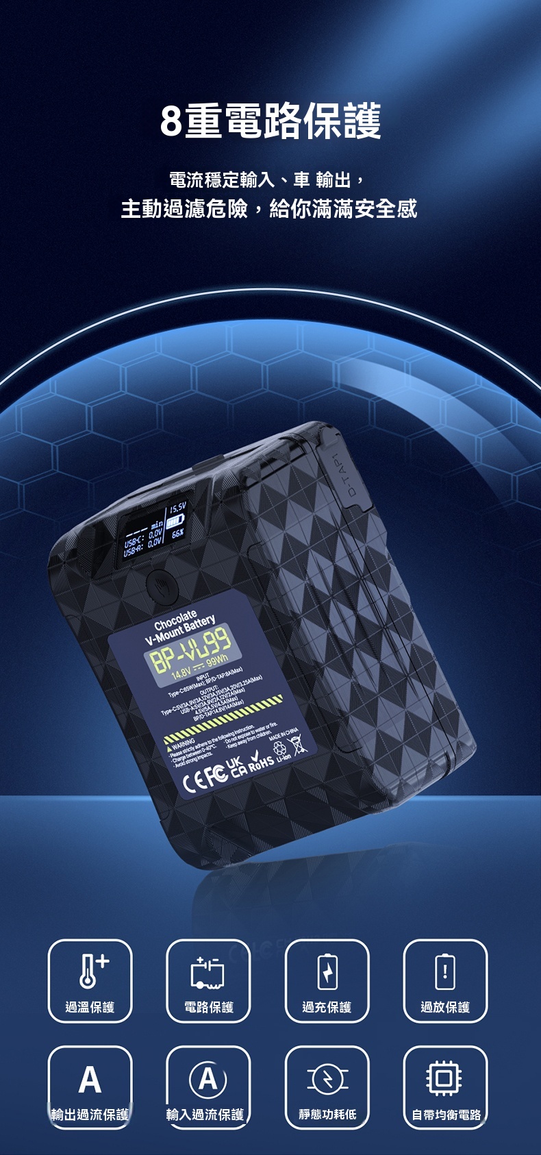 • 8重電路保護,包括過溫、過充、過放、輸出過流等,提供全面的安全保障
