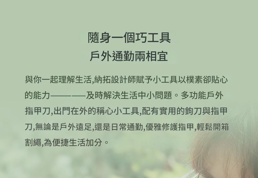 納拓多功能戶外指甲刀,採用高品質馬氏體不鏽鋼打造,堅韌鋒利且防銹,適合戶外與日常使用。輕薄型人體工學設計,延長力臂讓操作更省力舒適。內建實用的指甲刀與鉤刀,可應對開箱、割繩等多種需求,並配有細膩銼紋,修護指甲不留毛刺。表面經發黑處理及磨砂處理,質感細緻易清潔,搭配鑰匙圈方便隨身攜帶。小巧時尚的設計,彰顯個性化品味,是出門在外的理想小工具。