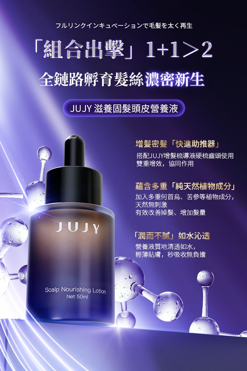 作為 JUJY LLLT 光療增髮梳 PRO 的專用搭檔,這款頭皮營養液專為協同增髮梳提升護髮效果設計,含純天然植物成分,溫和無刺激,更添加菸鹼酰胺、側柏葉萃取物、泛醇等活性成分,精準作用於頭皮與髮根。精華液膚感輕盈柔滑,接觸頭皮後能密集釋放有效成分,不僅可有效改善掉髮、增加髮量,還能針對性解決毛躁、打結翹發、乾枯無光澤等髮質問題,讓秀發重煥發澤順滑。使用時需先吹乾頭髮並保持頭皮乾燥,搭配增髮梳導液硬梳齒頭使用,往儲液倉滴入 8-9 滴至滿而不溢,操作簡單便捷,居家即可享受精緻奢護,為你帶來高效又舒適的護髮體驗。
