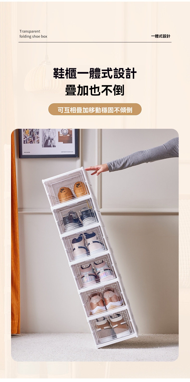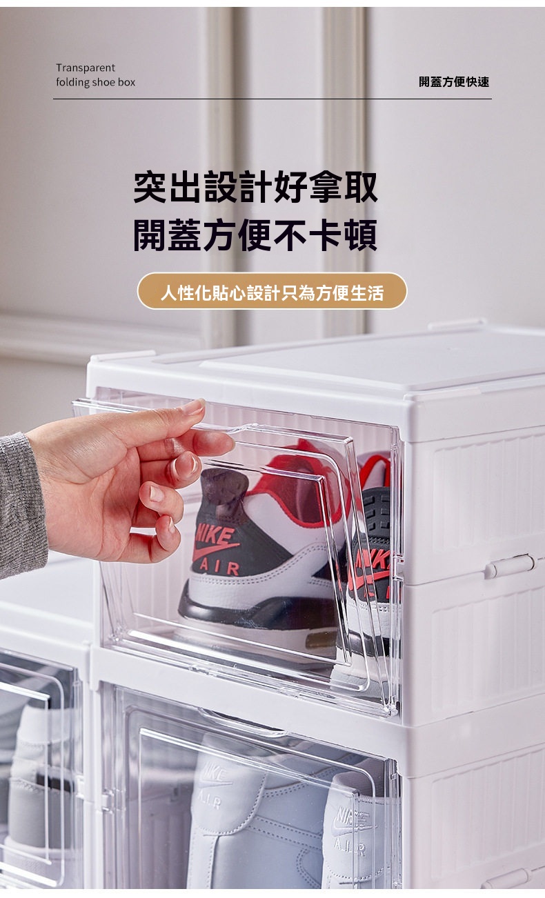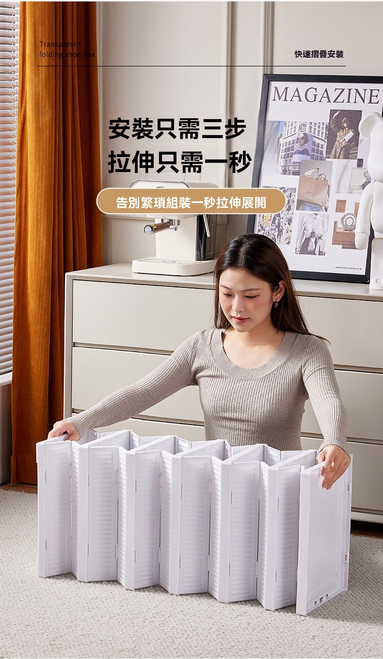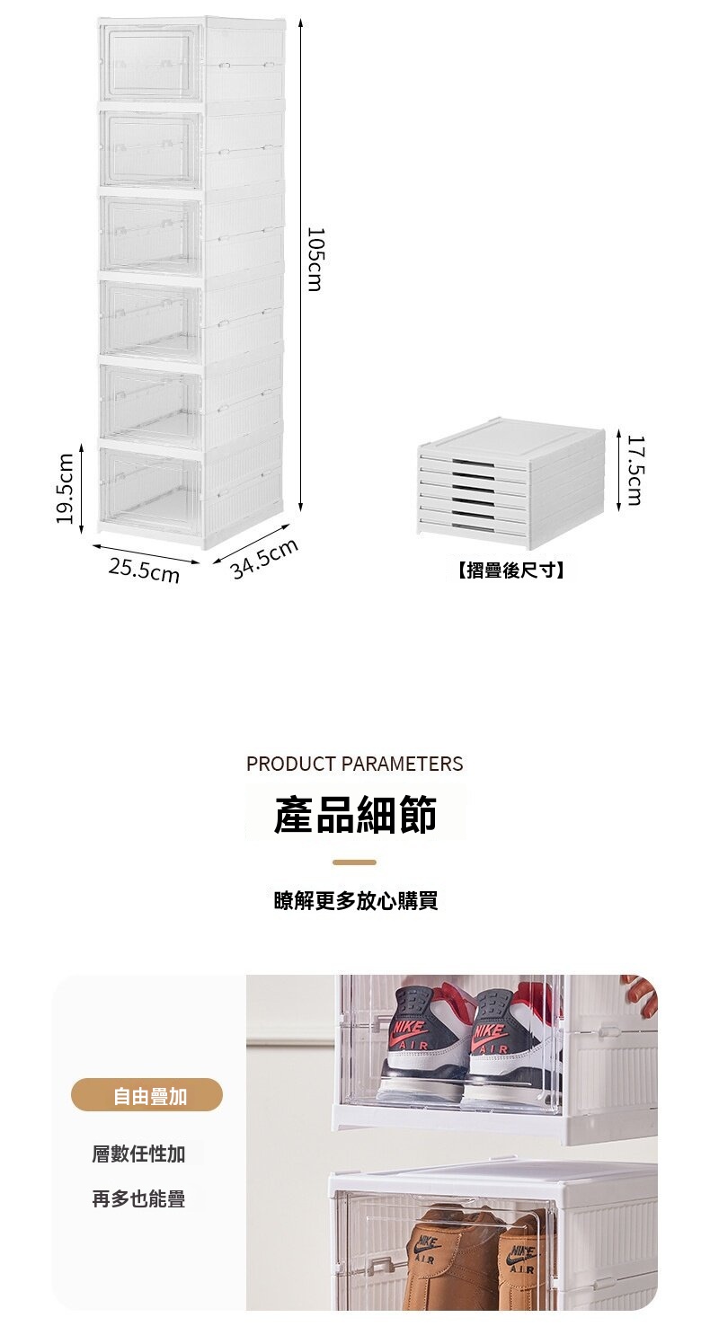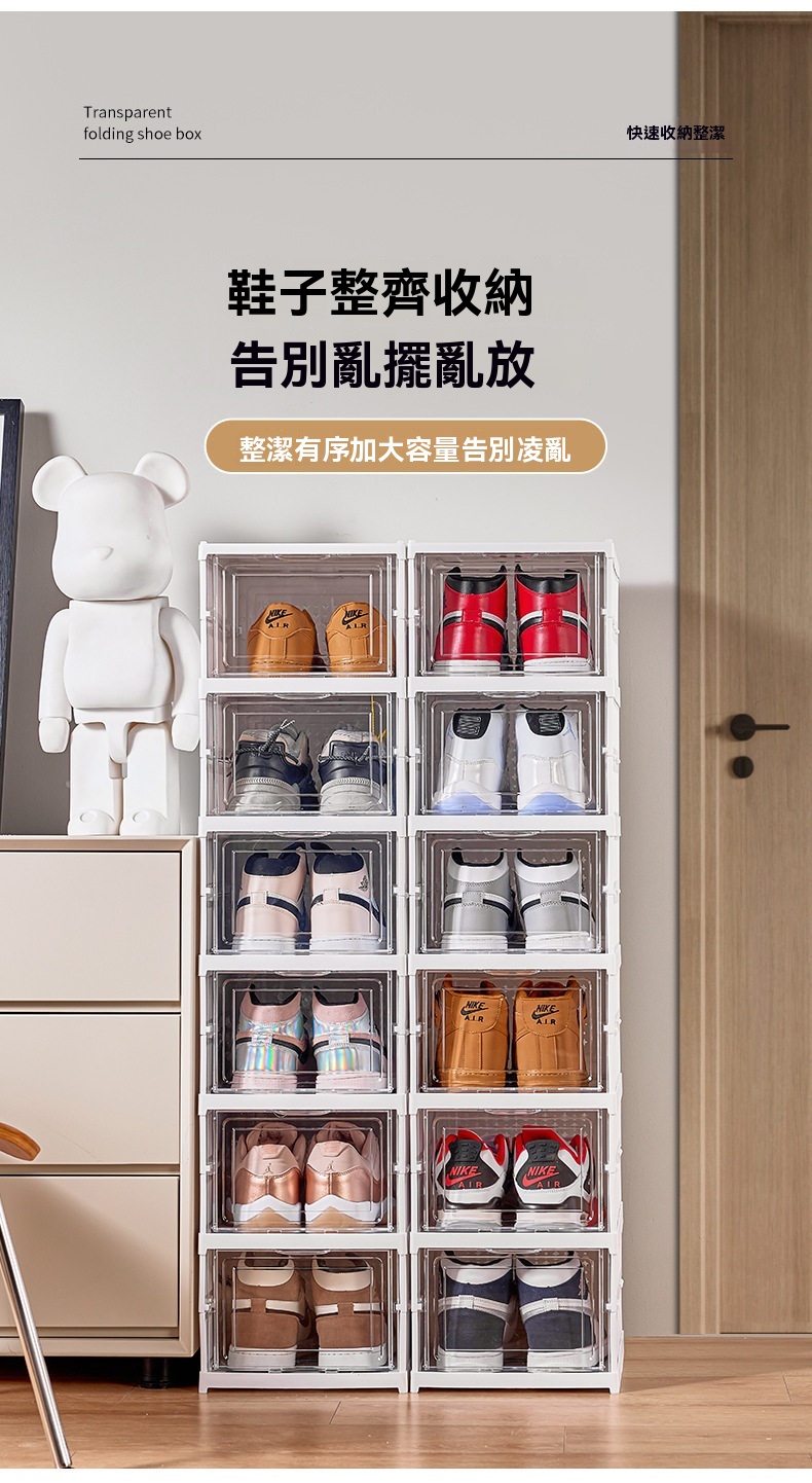 這款免安裝加厚可折疊一體成型鞋櫃,專為解決居家收納難題設計。採用一體式拉伸結構,告別繁瑣組裝,三步即可完成安裝,一秒拉伸展開,收納時也能快速扁平折疊,不佔空間。鞋櫃為PS+PP材質製成,無甲醛異味,材質健康安心。高透面板讓內部鞋子一目瞭然,找尋方便;背板設有透氣孔,保持空氣流通避免受潮。內部採用加大空間與加高間距設計,無論是46碼運動鞋、老爹鞋、馬丁靴,甚至是10公分高跟鞋皆能輕鬆收納。單個鞋櫃結構穩固,可互相叠加且不易傾倒。側開式門板拿取順暢,讓進出門換鞋更便捷,保持玄關整潔有序。