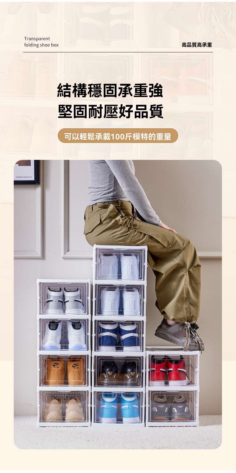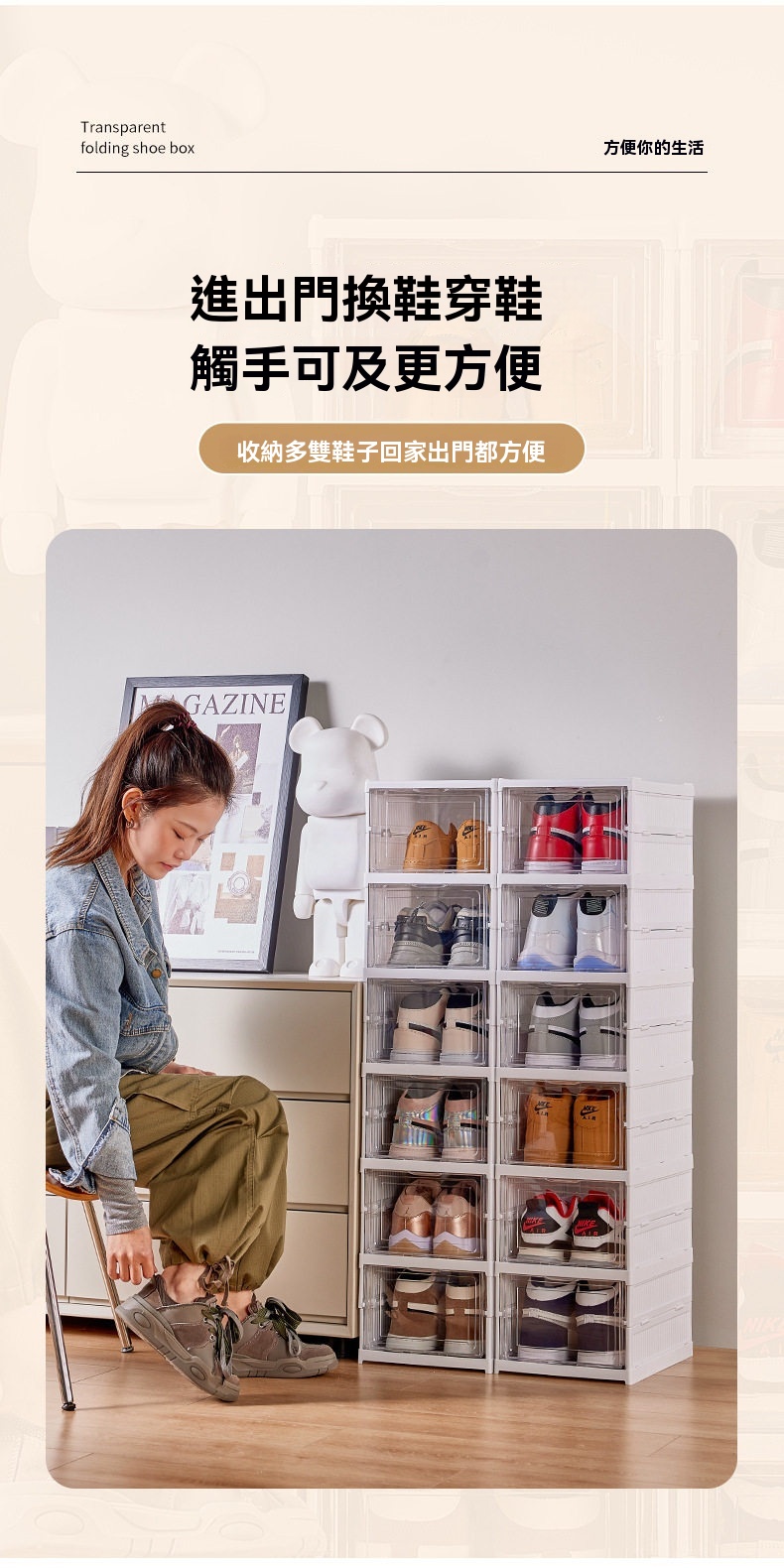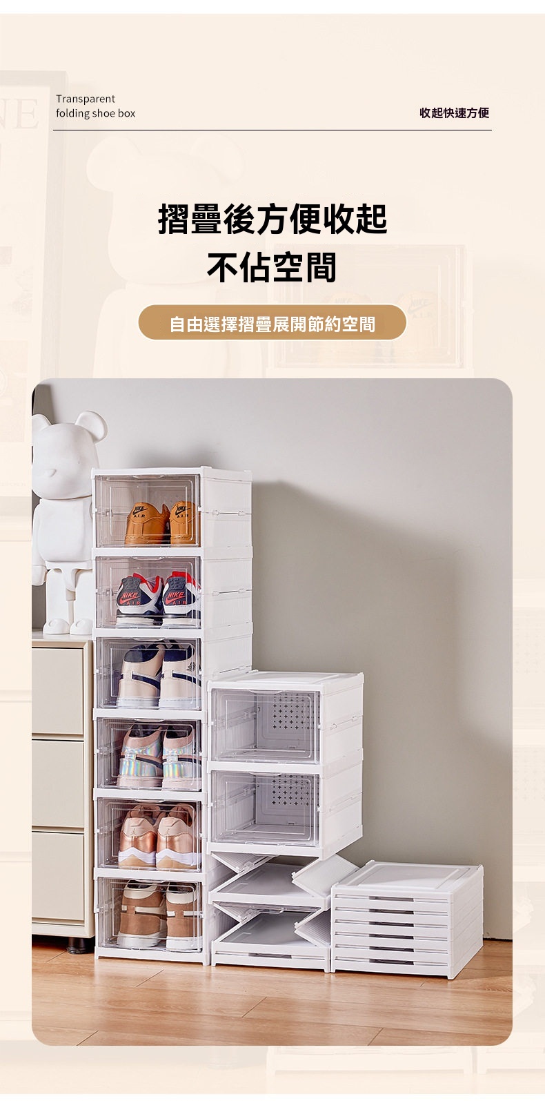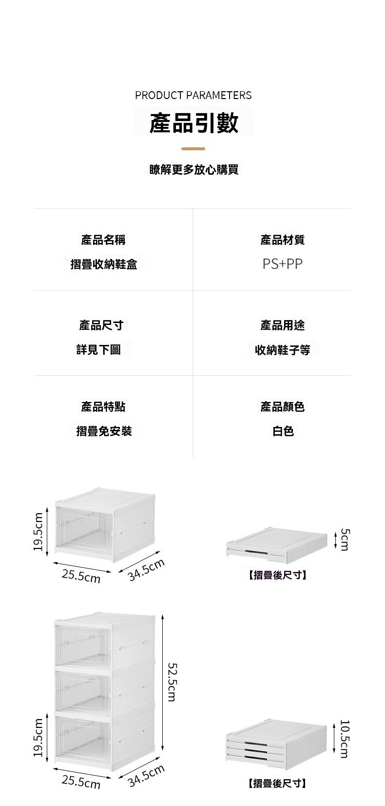 這款免安裝加厚可折疊一體成型鞋櫃,專為解決居家收納難題設計。採用一體式拉伸結構,告別繁瑣組裝,三步即可完成安裝,一秒拉伸展開,收納時也能快速扁平折疊,不佔空間。鞋櫃為PS+PP材質製成,無甲醛異味,材質健康安心。高透面板讓內部鞋子一目瞭然,找尋方便;背板設有透氣孔,保持空氣流通避免受潮。內部採用加大空間與加高間距設計,無論是46碼運動鞋、老爹鞋、馬丁靴,甚至是10公分高跟鞋皆能輕鬆收納。單個鞋櫃結構穩固,可互相叠加且不易傾倒。側開式門板拿取順暢,讓進出門換鞋更便捷,保持玄關整潔有序。