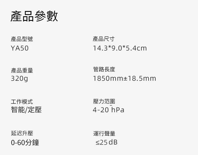 SNORE CIRCLE YA50 智能監察便攜自動睡眠呼吸機 是一款旨在幫助患有打鼾和睡眠障礙的人的設備。當睡眠期間氣道變窄,引起振動並導致打鼾的聲音時,就會發生打鼾。YA50通過在連續模式或自動調節模式下提供氣道正壓來幫助防止打鼾,從而保持氣道開放並保持規律的呼吸模式。