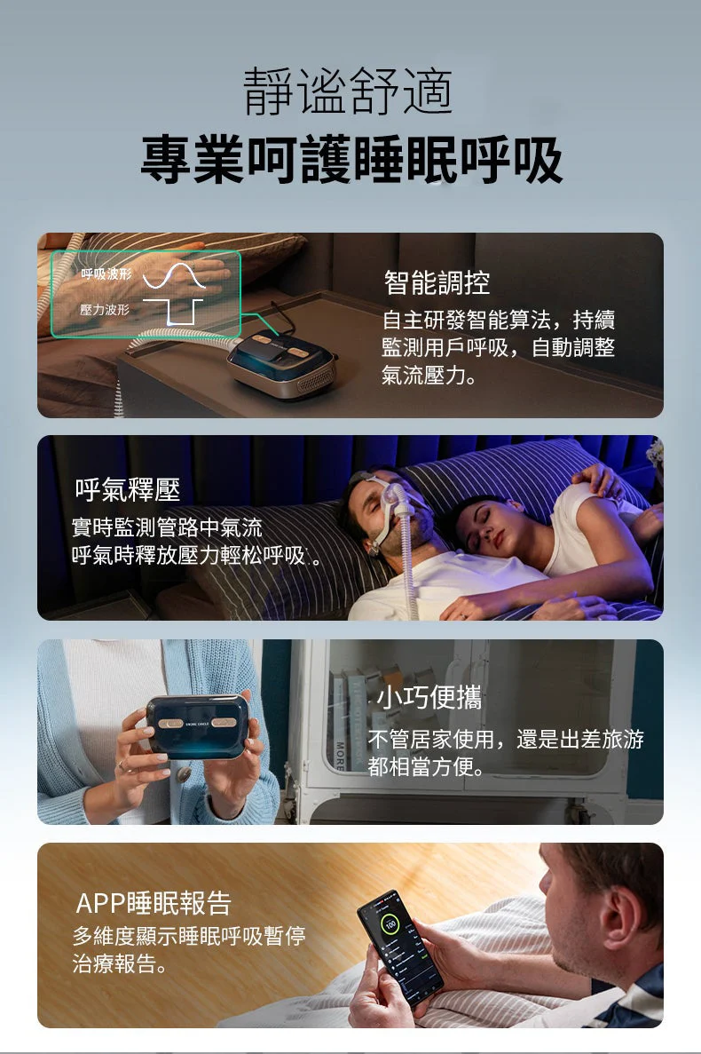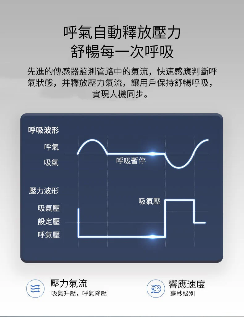 • 智能調節技術|識別睡眠呼吸狀態及自動調節氣流強度;