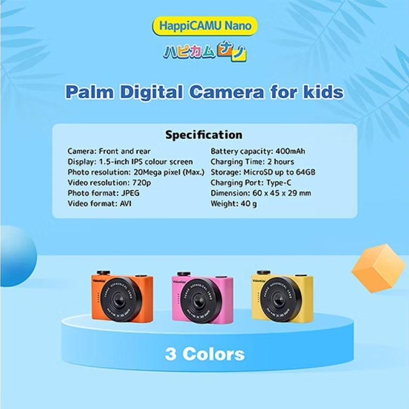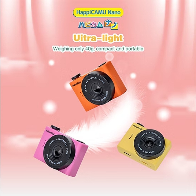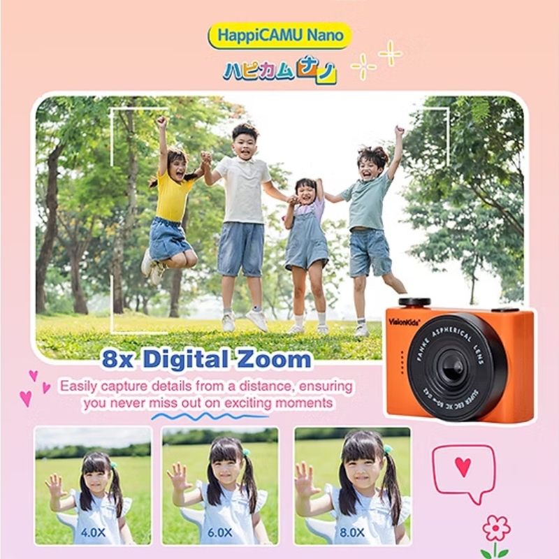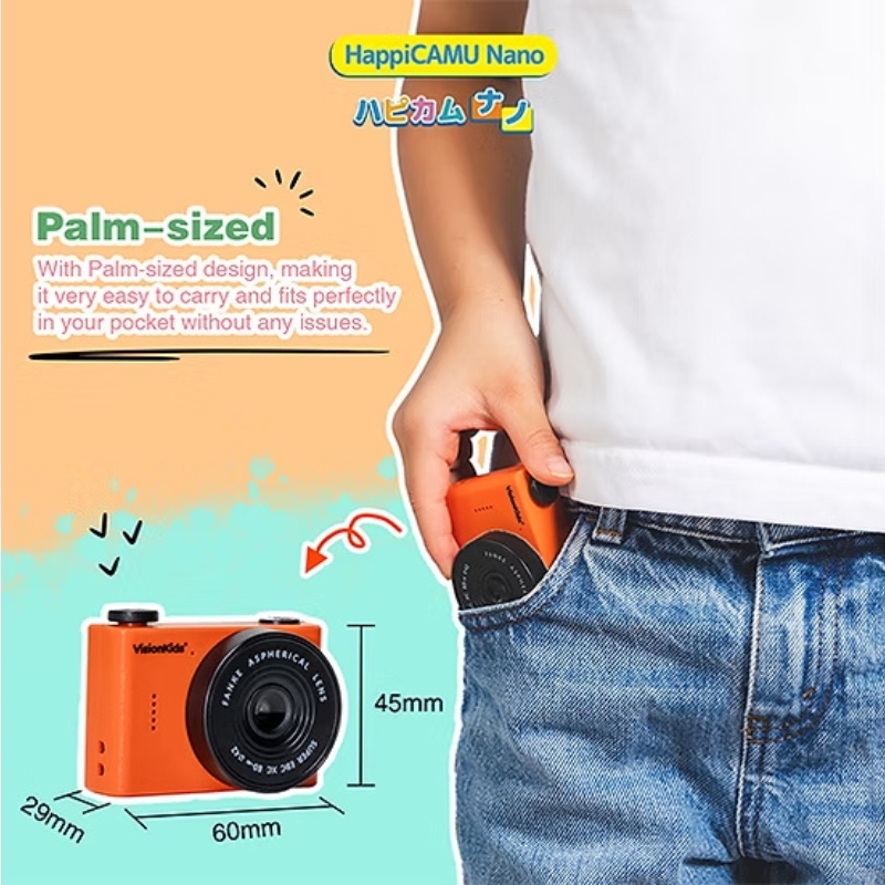 VisionKids HappiCAMU Nano 是一款專為兒童設計的迷你數碼相機。它擁有僅40克、掌心大小(60毫米 x 45毫米 x 29毫米)的超輕巧機身,方便孩子隨身攜帶。相機配備前後雙鏡頭,支援高達2000萬畫素的照片拍攝和720p影片錄製,並具備8倍變焦功能。 1.5吋IPS彩色螢幕讓孩子能即時預覽作品,內建的趣味卡通相框更能激發創造力。它操作簡單,適合6歲以上兒童使用,是能讓孩子輕鬆記錄生活、開啟攝影冒險的得力夥伴。