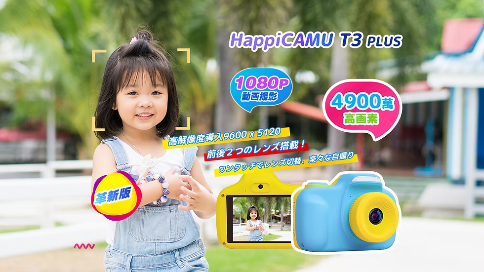 VisionKids HappiCAMU T3+ Wifi 兒童數碼相機是一款專為孩子設計的高清觸控相機。它配備了4900萬像素鏡頭,可拍攝超高解析度照片(最高9600 x 5120),並支援前後雙鏡頭切換,讓孩子輕鬆享受自拍樂趣。相機採用3吋IPS觸摸屏,操作直觀。內置Wi-Fi功能,可將檔案傳輸至智慧型手機。它還內建了可愛相框,並支援自動色彩調整、自動亮度調整及全自動拍攝模式,讓孩子能輕鬆捕捉精彩瞬間。相機最大支援64GB Micro SD卡,重量僅110克,輕巧便攜。