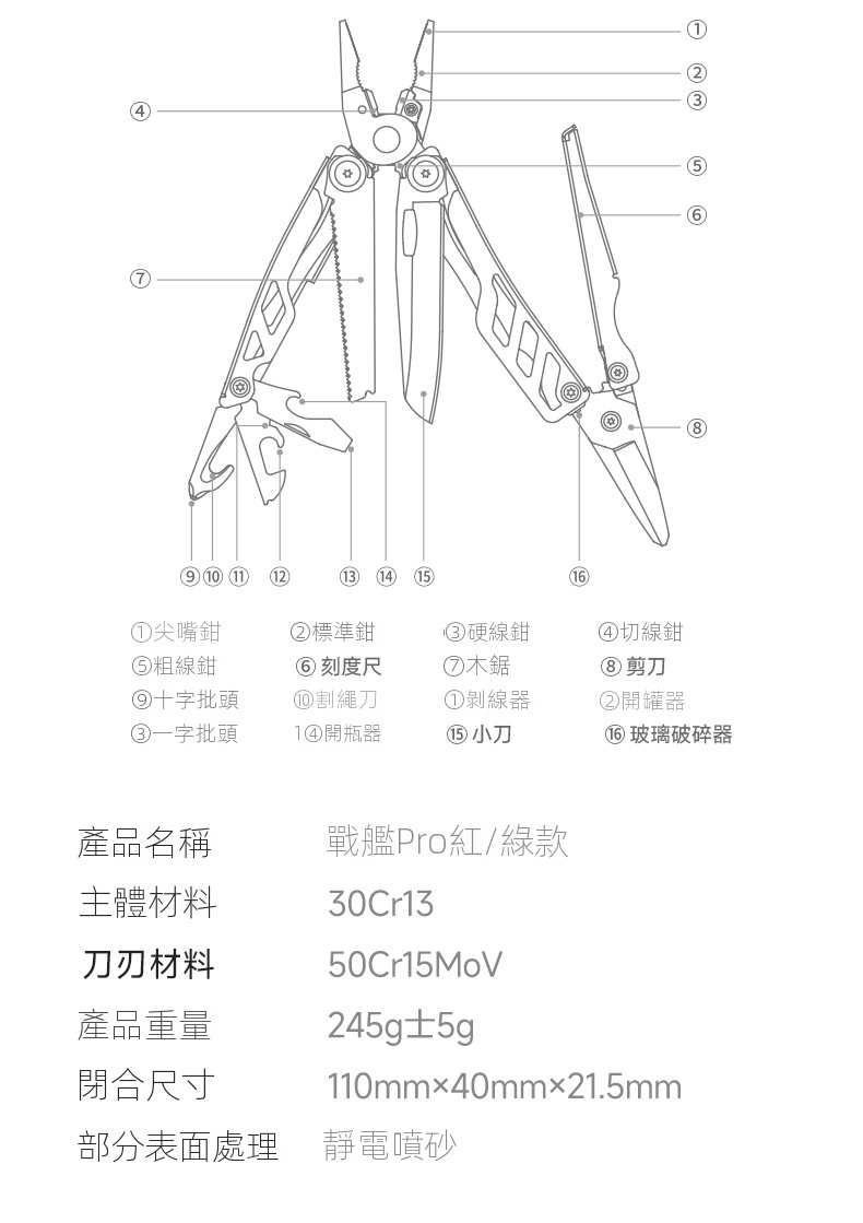 納拓戰艦PRO多功能工具刀採用高強度鋼材製成,具備16種實用工具有效提升效率。專利大剪刀設計,同尺寸中表現卓越,適合EDC日常攜帶與生存裝備需求。主要工具包括尖嘴鉗、標準鉗、硬線鉗、切線鉗、木鋸、十字批頭、割繩刀等,滿足多樣化使用情境。38mm長嘴大剪刀與鉗子共用手柄,握持舒適,能應對高強度作業。靜電噴塗工藝赋予藍色外觀,盡顯硬派風格。值得注意的是,產品表面可能存在輕微劃痕,屬於正常現象。總體而言,戰艦PRO是一款集實用性與耐用性於一身的優質工具刀。