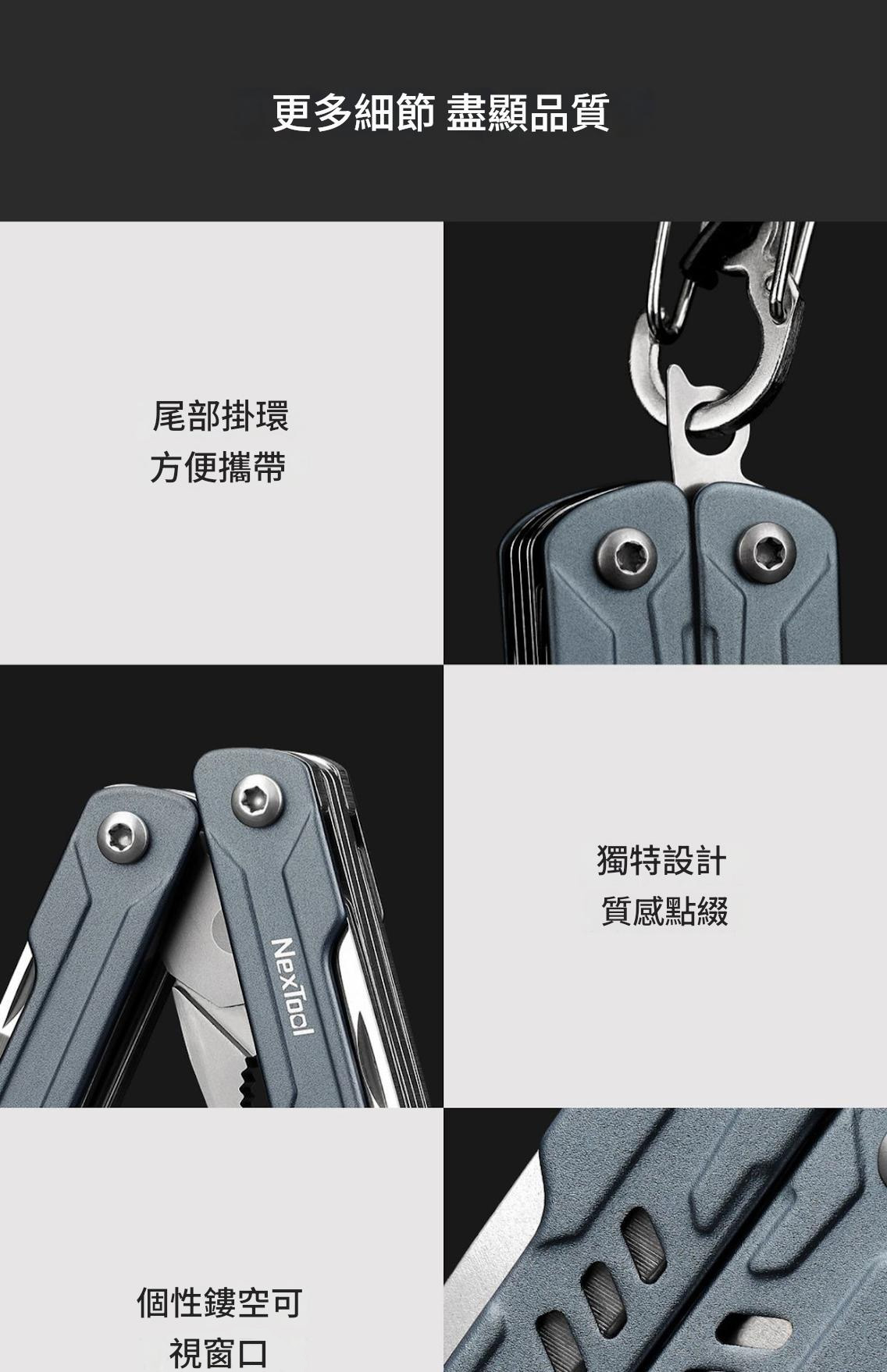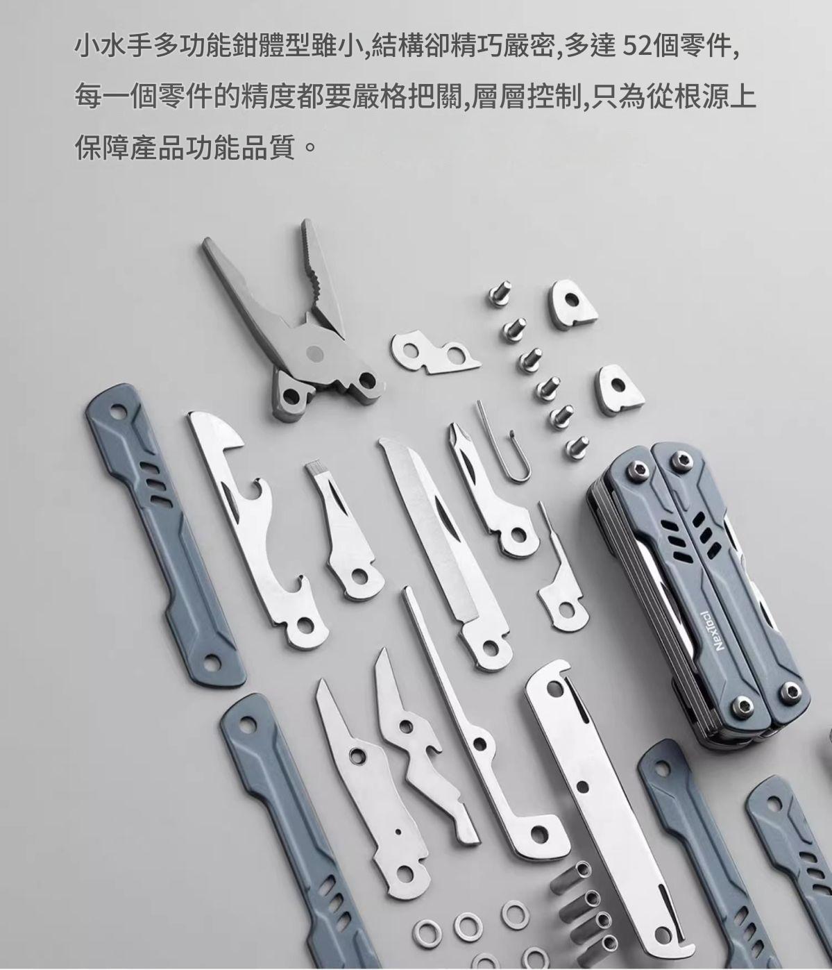 納拓小水手多功能工具刀,採用槍灰色氧化鋁手柄,時尚質感。閉合僅6.7cm,重84g,輕巧便攜,隨時隨地成為你的得力助手。此工具融合了鉗子、小刀、螺絲刀、剪刀、開瓶器等10種功能,能應對多樣化的日常需求,無論是戶外還是家居場景都能大顯身手。其精沖工藝製造,搭配420J2不銹鋼材質,確保耐用與鋒利。精密的結構設計,52個零部件精益製造,保障每一個細節的完美契合,讓你在各種情況下都能從容應對,享受便捷生活。尾部掛環設計更增添實用性,方便攜帶。
