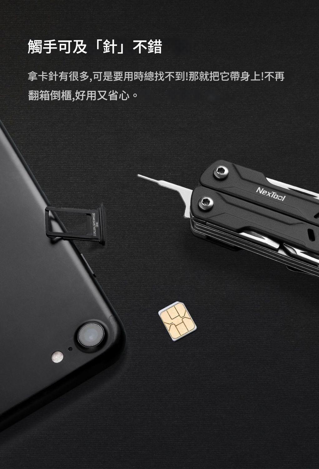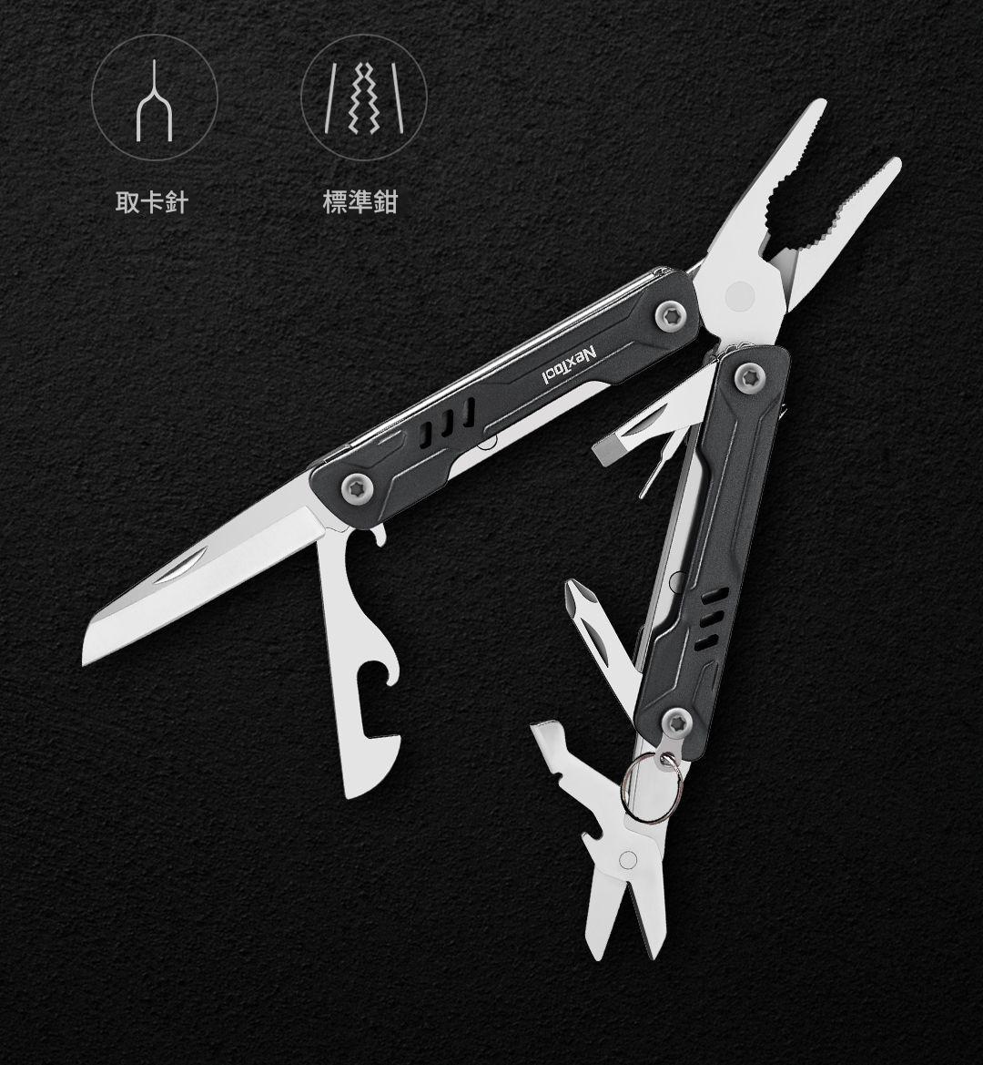 • 功能列表:尖嘴鉗、標準鉗、細線鉗、取卡針、一字螺絲刀、開罐器、開瓶器、十字螺絲刀、小刀、剪刀