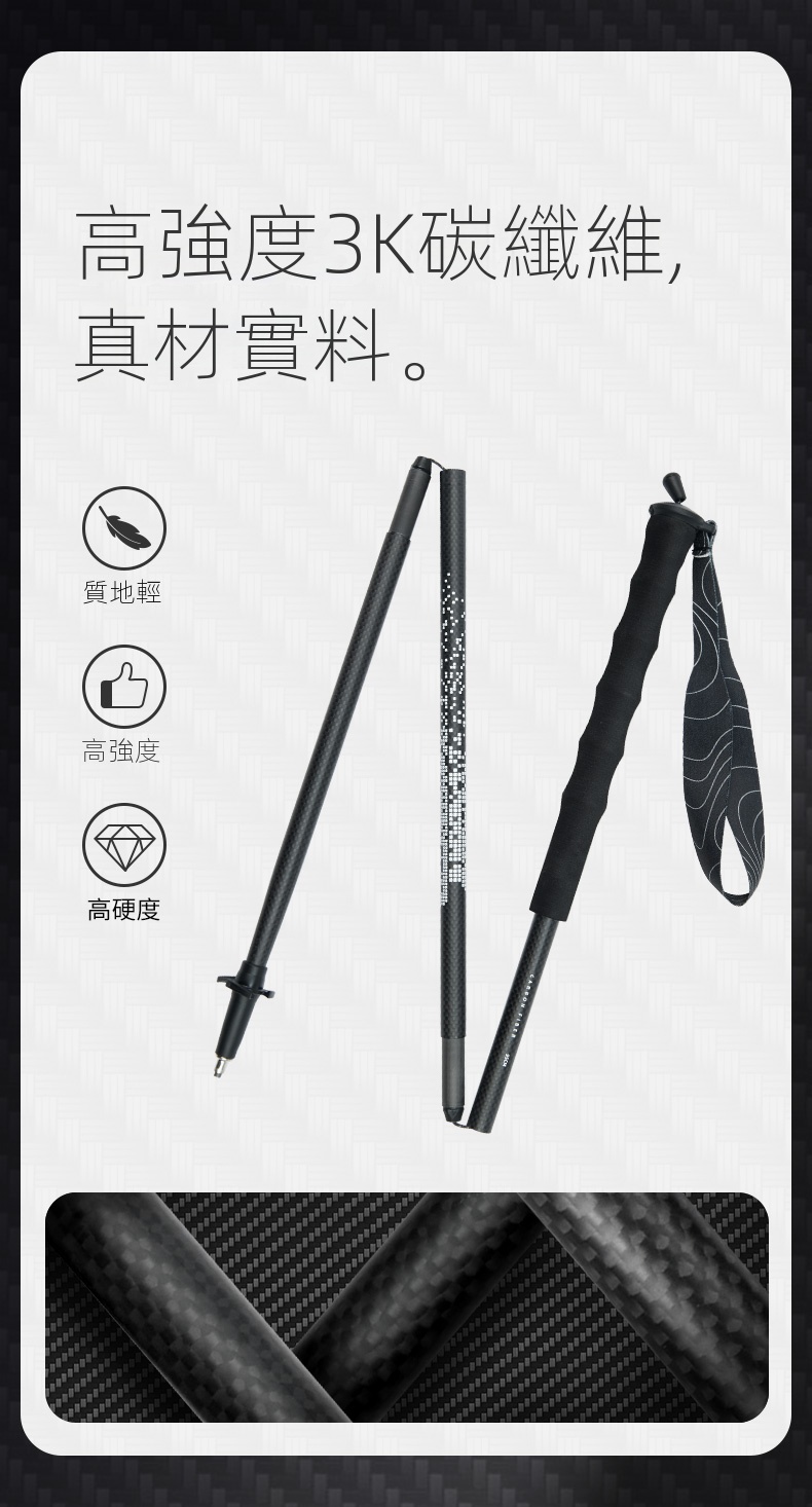 • 採用高強度3K碳纖維材質,質地輕且強韌,節與節連接加厚,防斷裂。