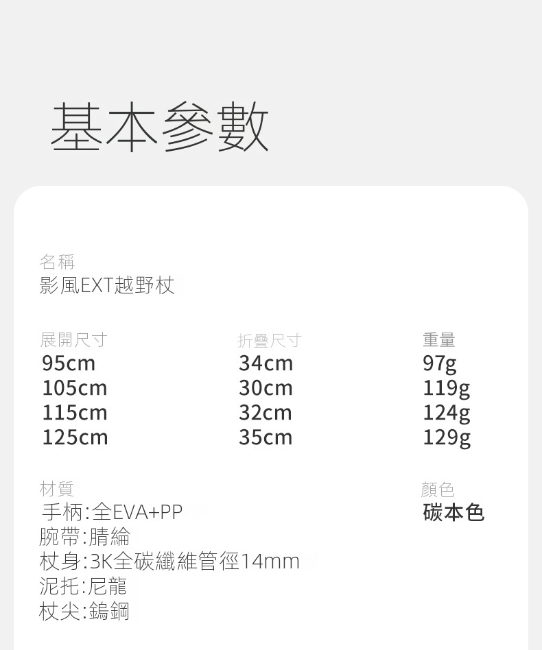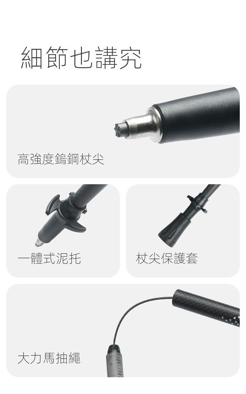 • 高強度鎢鋼杖尖,配備一體式泥托和杖尖保護套,耐用且安全。
