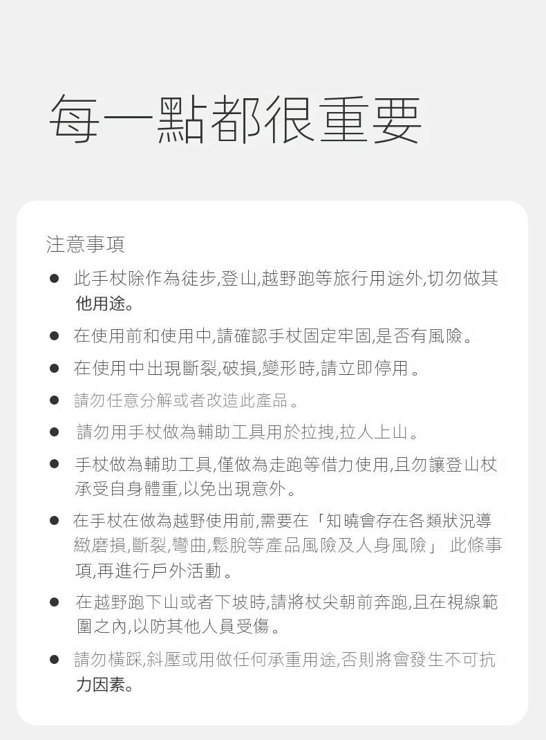 • 注意事項:請勿用手杖做為輔助工具用於拉拽或承重,使用前確認手杖固定牢固,出現斷裂或破損時立即停用。