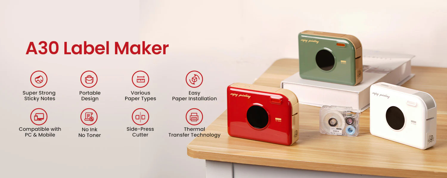 Phomemo A30是一款輕巧便攜的家用標籤機,重僅258g,尺寸為131×95×38.5mm,可隨時隨地列印標籤。它採用1200毫安培時鋰電池,續航力2.5小時。列印解析度達203dpi,成像深色清晰,列印效果順滑。支援熱轉印技術,無需墨盒,操作簡單還環保。具備高相容性,可透過鍵盤直接編輯列印,也支援iOS、安卓等行動裝置無線列印。耗材防水、耐寒、耐高溫、耐化學腐蝕且耐磨,適用於花園、廚房、浴室、辦公室等場景,透過「Print Master」應用程式與藍牙輕鬆連接,有海量設計素材可供選擇 。