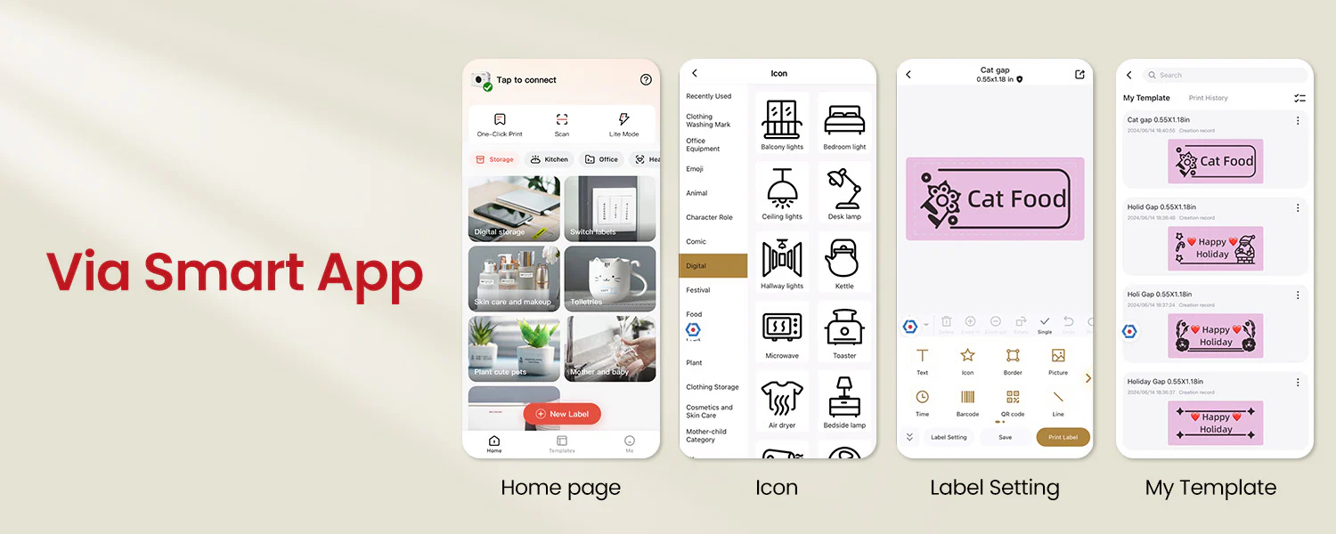 • 輕鬆連接智慧應用程式: 一體化「Print Master」應用程序,支援藍牙連接。海量標籤設計材料選擇,1秒鐘即可實現藍牙連接。