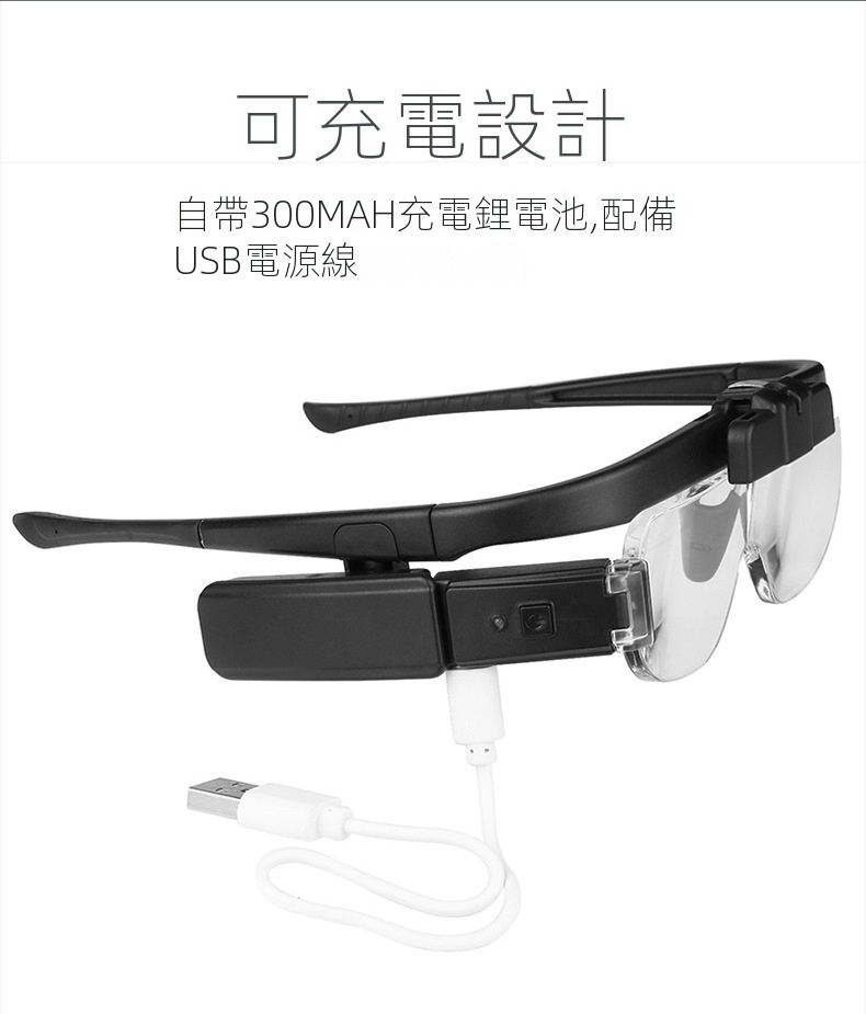 充電眼鏡式放大鏡 ,採用 ABS、金屬配件及三組亞克力光學鏡片,提供 4.5倍或以下多組倍率放大,內建 300mAh 充電鋰電池,配備 USB 電源線及兩顆可調亮度的 LED 燈,適用於閱讀、維修、玉石鑑定等場景。