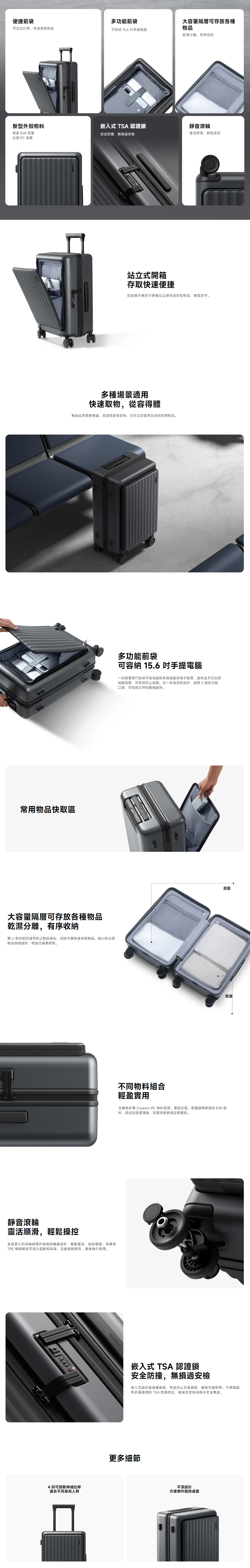 XIAOMI BHR8767GL 前開蓋式20吋行李箱,以1:9大開口設計重新定義便捷收納,輕鬆放入15吋筆電與隨身物品。內部乾濕分區保持整潔,55mm大直徑全向輪確保推行順暢穩定,搭配TSA密碼鎖,出行安全又省心。緊湊尺寸可直接登機,是商旅與短途出行的智能首選。
