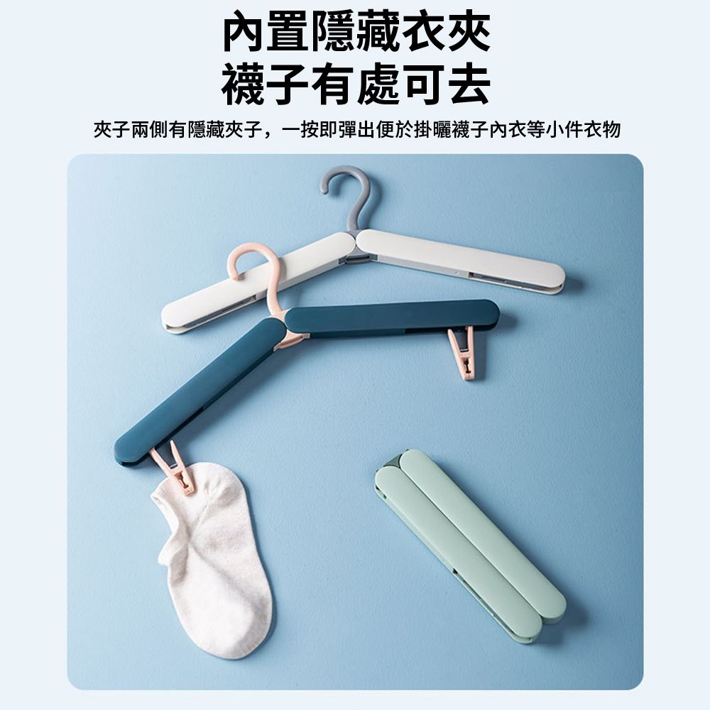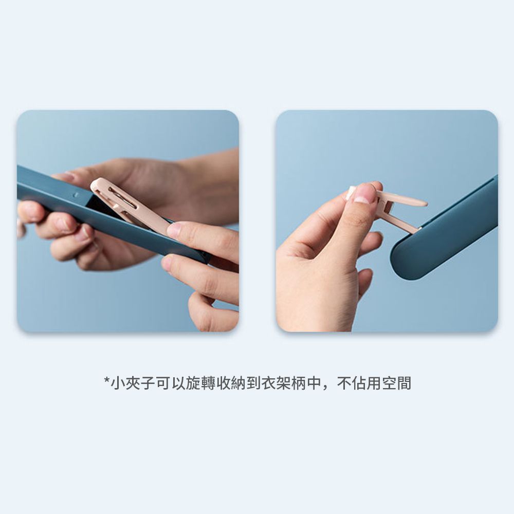 • 衣架兩側有隱藏夾,一按即彈出,用於懸掛襪子、內衣、毛巾等