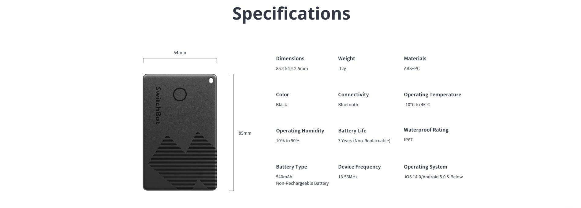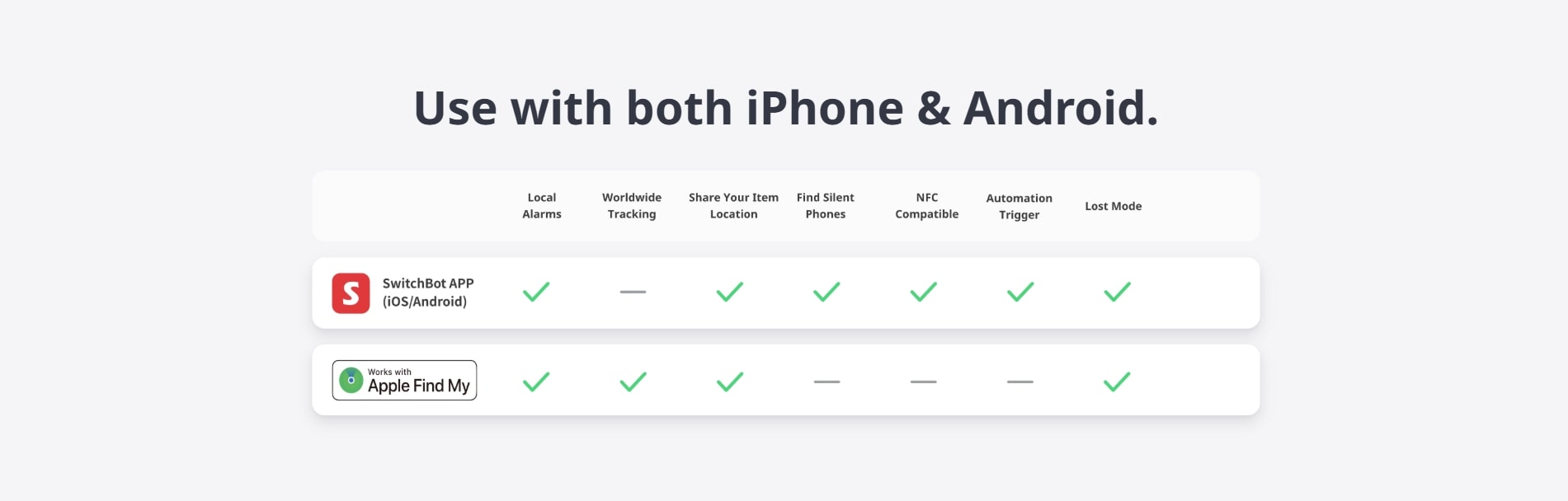 • 易於使用,設定快捷,通用相容性:SwitchBot 錢包查找卡相容於 iPhone 和安卓設備,設定過程只需不到 30 秒,方便所有用戶輕鬆上手,無需任何技術背景。輕鬆享受尖端科技帶來的便利。