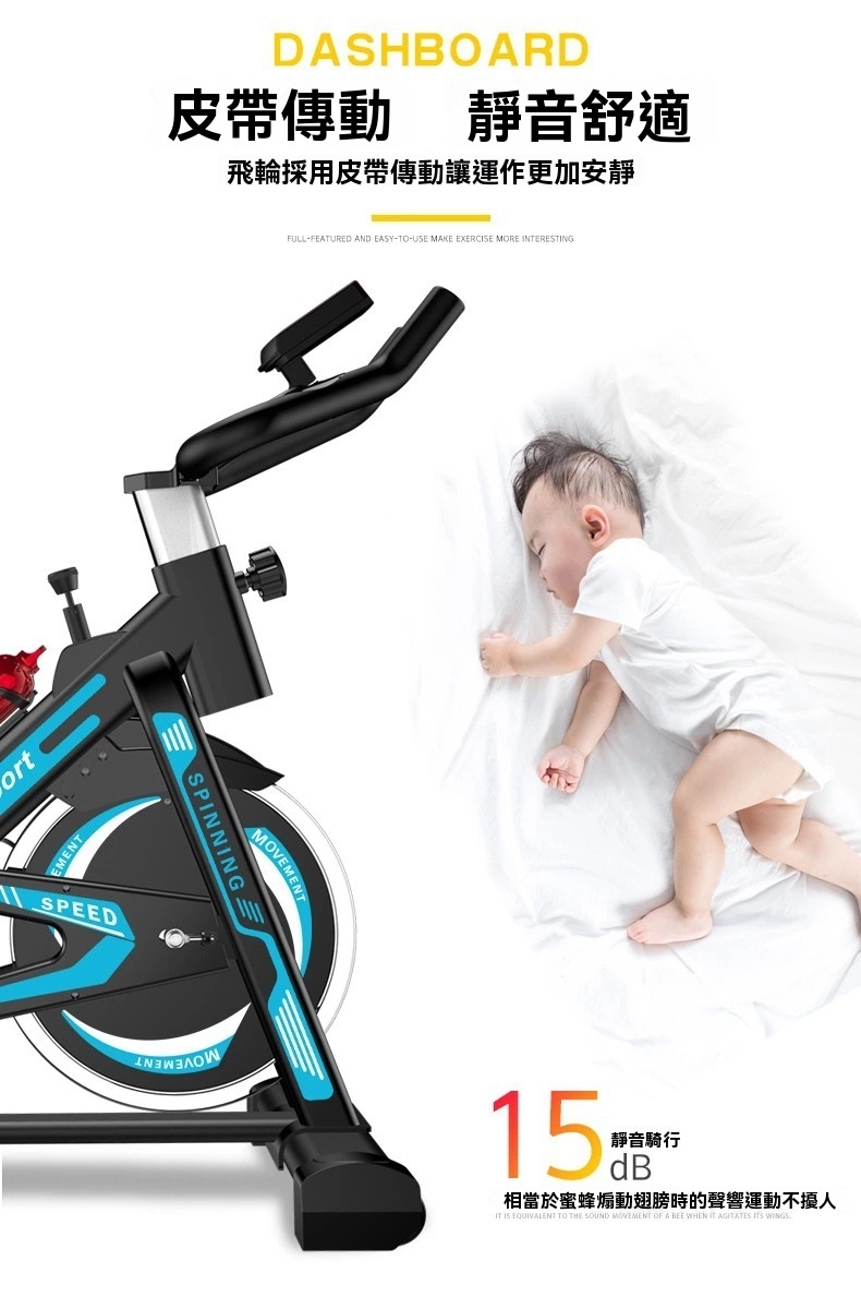 • 靜音皮帶傳動系統:採用高品質皮帶傳動,運作順暢且噪音低至15dB,相當於蜜蜂振翅聲,騎行不打擾家人鄰居。