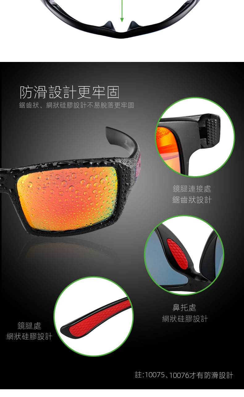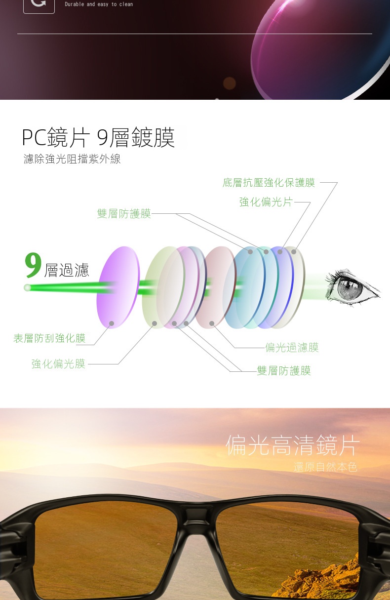 這款高性能偏光太陽鏡為你的戶外活動帶來全新視野體驗。採用9層鍍膜的PC材質鏡片,不僅能有效隔離強光與紫外線,還能呈現真實自然的色彩。流線型鋼化鏡架設計,不僅時尚炫酷,更能適合各種臉型。獨特的防滑設計更能確保佩戴穩固,無論是騎行、徒步、駕駛還是旅遊,這副偏光太陽鏡都能為你帶來清晰舒適的視野,呵護你的雙眼,全方位滿足你的戶外需求。