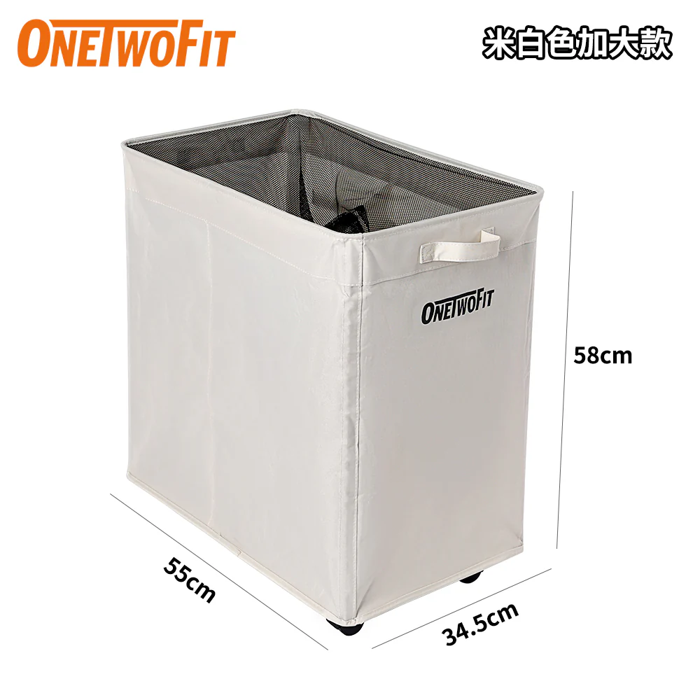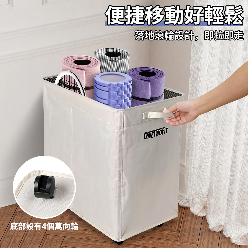 OneTwoFit OT051201 瑜珈墊收納袋,主打簡約實用的米白色配色,適合多種居家風格,輕鬆融入客廳、臥室、陽台等不同場景。袋身採用牛津布材質製作,材質堅韌不易磨損,能長期承載各類物品,兼具實用性與耐用性。產品展開尺寸為55×34.5×58cm,折疊後尺寸為55×34.5×10cm,不使用時只需取出支撐桿,即可大幅壓縮體積,方便塞進置物櫃或角落,不佔用多餘空間。它以大容量設計,不僅能妥善收納瑜珈墊、瑜珈輪、筋膜球等運動器材,還可存放衣物、玩具、毛巾等居家雜物,用途廣泛。袋身搭配網布束口設計,可固定零散小物件防止掉落;底部裝有4個萬向輪,推動時順滑不卡頓,讓物品搬運更省力,助力保持家居環境整潔有序。