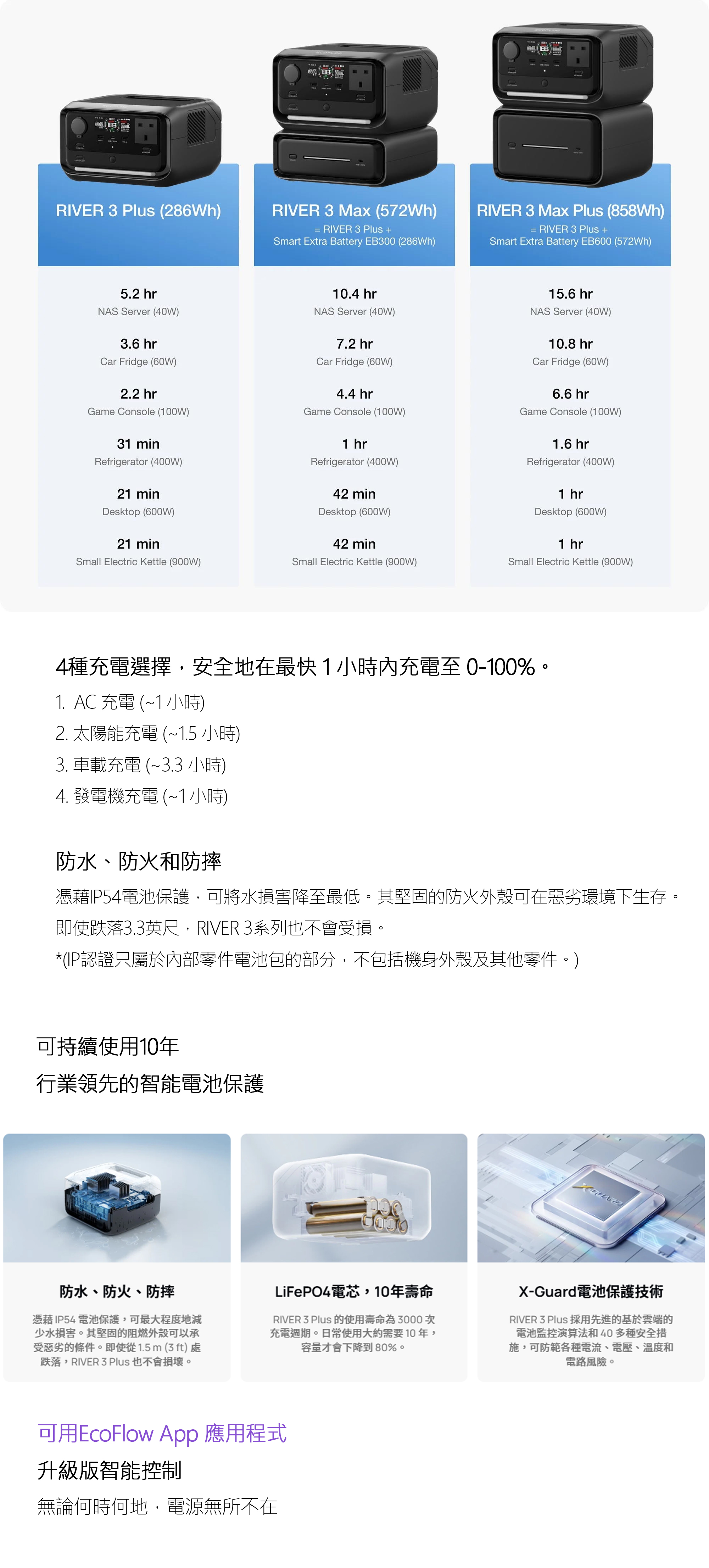 透過搭配額外電池 EB300(286Wh)或 EB600(572Wh),RIVER 3 Plus 可輕鬆擴展容量,最高可達 858Wh,提供穩定且高效的電力支援,專為滿足不斷增長的能源需求而設計,適合戶外活動、緊急備用或日常使用,讓您隨時隨地享受源源不絕的純淨能量。