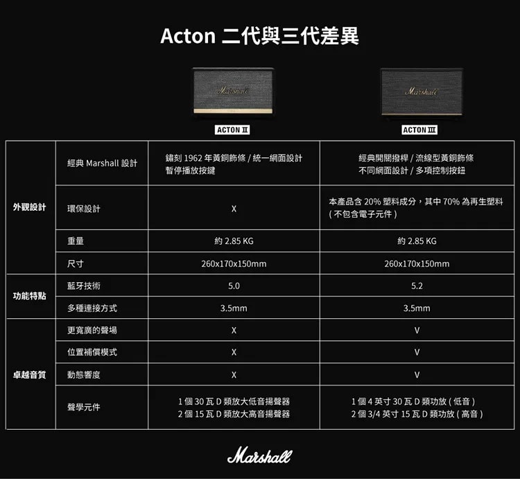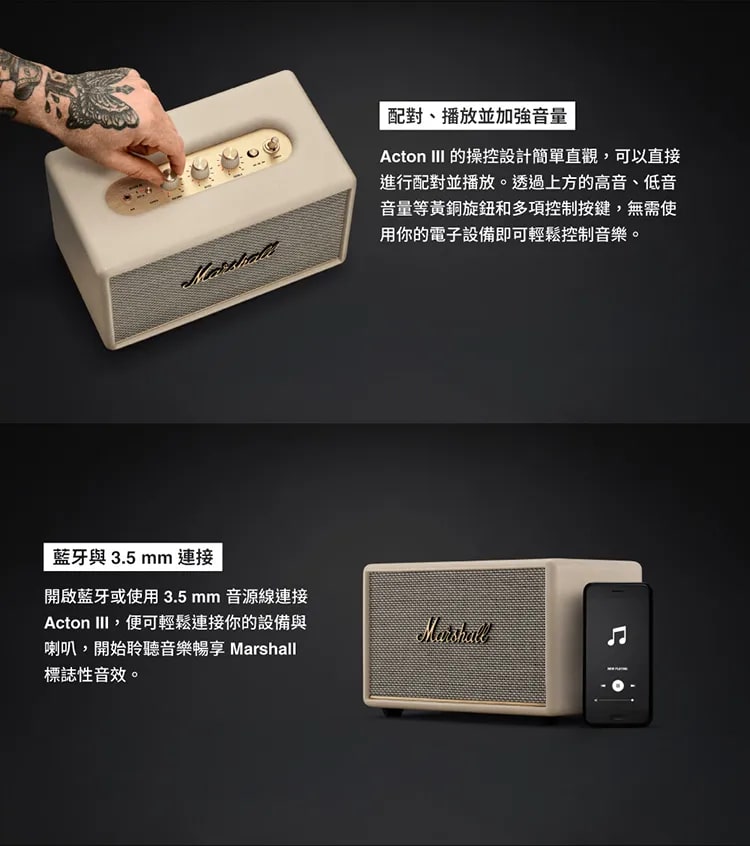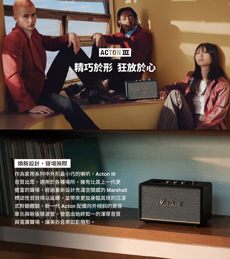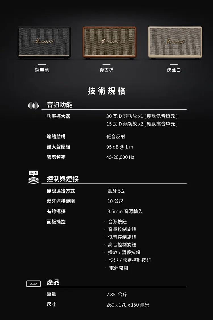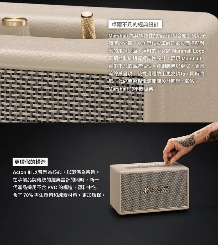 MARSHALL Acton III 家用無線藍牙喇叭是家庭系列中最隱密的藍牙揚聲器,憑藉升級配置帶來卓越音訊表現。它音場較前身較寬廣,搭配向外傾斜的高音揚聲器與更新波導,傳遞充滿房間的標誌性聲音,動態響度功能可優化各音量下的音調平衡,音質始終出色。產品無需複雜設置,配對播放便捷,設備自帶控制按鍵,操作直覺。搭載藍牙 5.2 無線連接,支援 OTA 無線更新,同時配備 3.5 毫米及 RCA 有線輸入,連接方式靈活。標誌性設計極具辨識度,Marshall 字體與黃銅旋鈕彰顯搖滾基因,提供原創黑色、復古奶油色、休閒棕色三種飾面選擇。機身不含 PVC,含 70% 回收塑膠與素食材料,尺寸 260x170x150 毫米,重 2.85KG,兼顧環保與實用性。