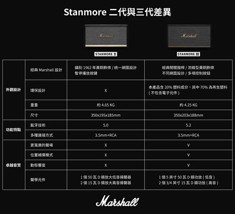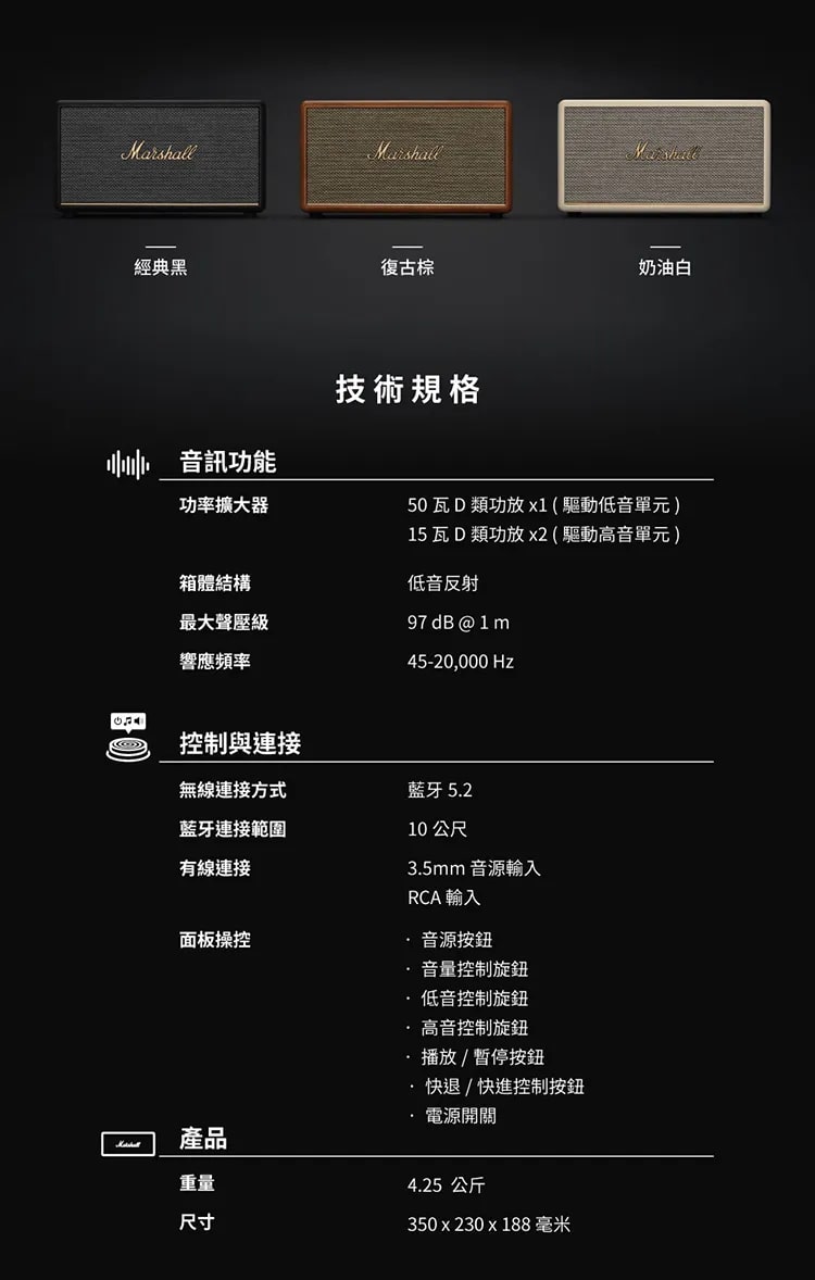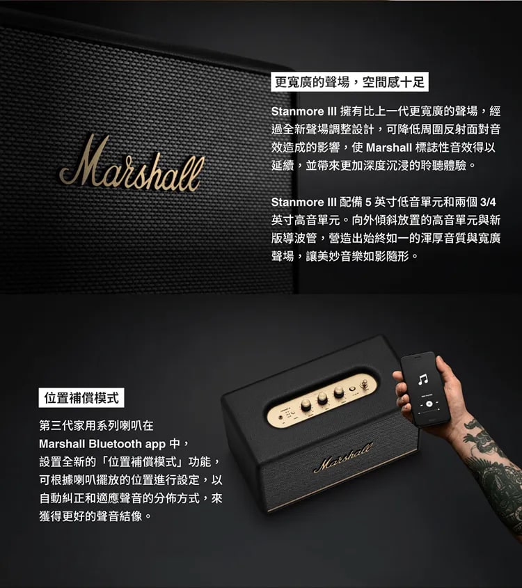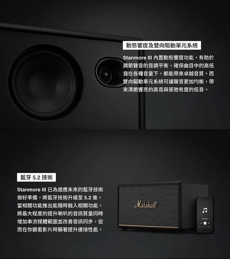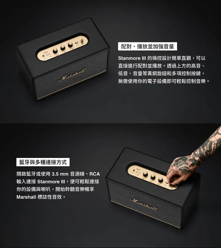 MARSHALL Stanmore III 家用無線藍牙喇叭延續品牌經典四方造型,外殼搭配標誌性黃銅色面板與旋鈕,復古質感拉滿。面板配備撥桿式開關、播放控制鍵、輸入切換按鈕及 3.5mm AUX 接口,搭配獨立音量、低音、高音控制旋鈕,操作直觀便捷。音質表現強悍,內置 50 瓦低音 D 類放大器與兩個 15 瓦高音 D 類放大器,頻響範圍覆蓋 45–20,000Hz,最大聲壓級達 97dB@1m。全新傾斜高音單體與導波管設計優化聲場,動態響度技術確保各音量下聽感均衡有力。支援藍牙 5.2 無線連接,也可透過 RCA 或 AUX 有線連接,並相容於 Marshall Bluetooth App 控制及 OTA 升級,尺寸 350x203x188mm、重 4.25kg,兼具實用性與擺設美感。