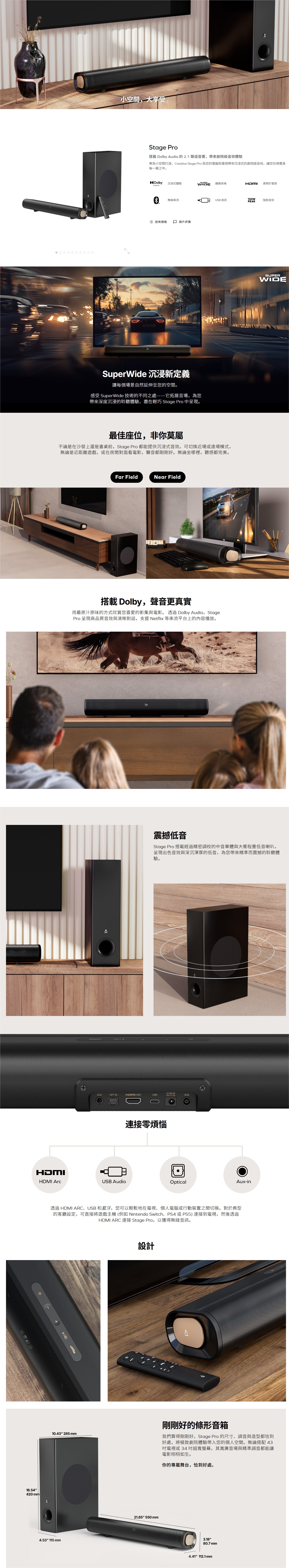 Creative Stage Pro 2.1 Soundbar 音響組合專為小空間設計,能為電視、電腦帶來沉浸式劇場等級音效,讓你彷彿置身每一幕場景。它搭載 Dolby Audio 技術,呈現高品質音效與清晰對話,完美適配 Netflix 等串流平台內容;配備 SuperWide 技術,能拓寬音場,帶來深度沉浸聆聽體驗,也支援近場、遠場模式切換,無論在沙發觀影或書桌前遊戲,都能獲得適配音效。音響含精密調校的中音單元與大衝程重低音喇叭,總輸出 80Wrms(峰值 160W),頻率響應 50–20,000Hz,低音深沉渾厚。支援 HDMI 2.0、藍牙 5.3(A2DP 協議,傳輸距離達 10 公尺)、USB 等連接方式,可輕鬆連接電視、電腦、手機及 Nintendo Switch、PS4/5 等遊戲主機,兼顧實用性與便利性。