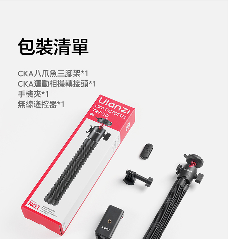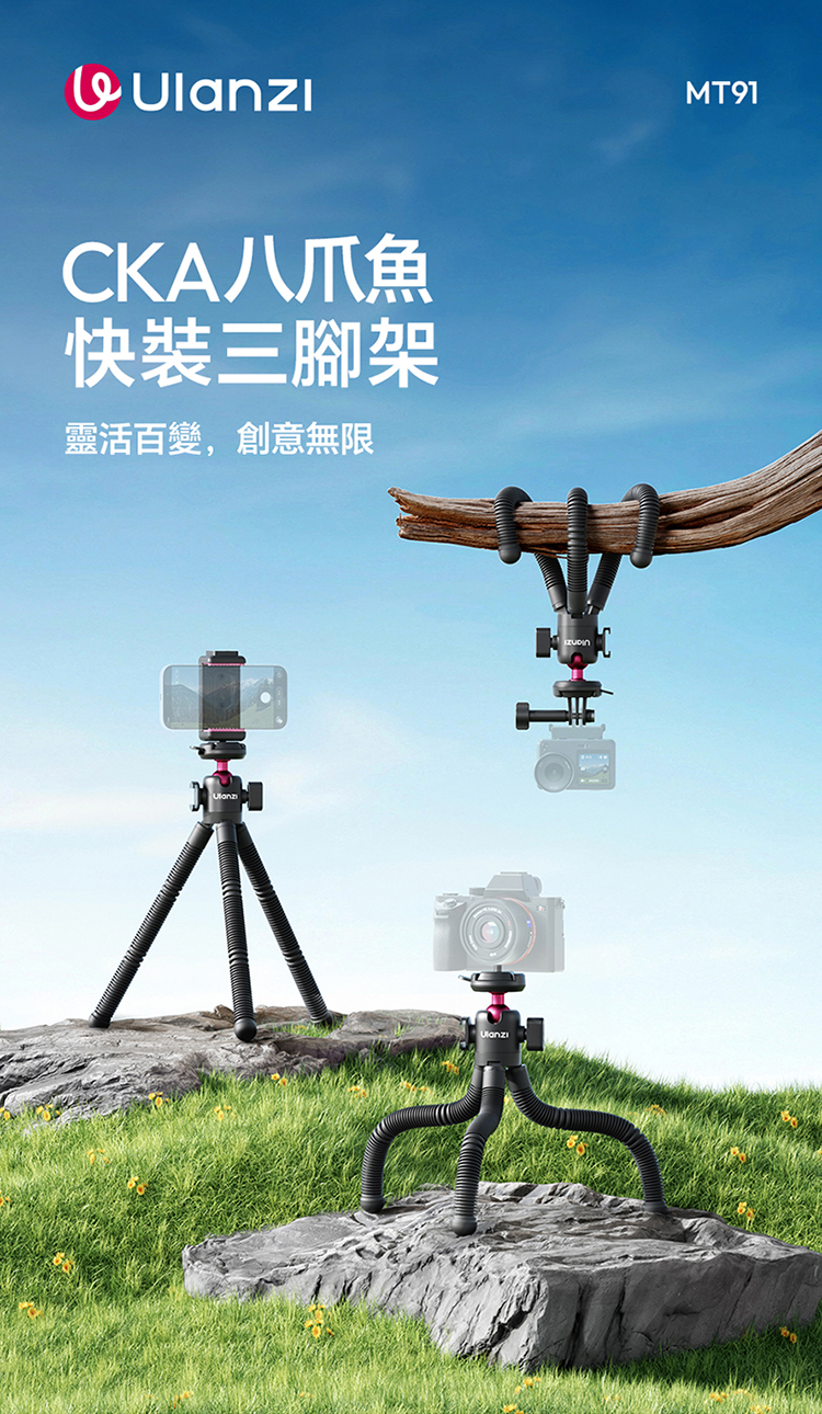 ULANZI MT-91 CKA 八爪魚三腳架是一款專為現代行動創作設計的極致便攜支架。它採用靈活的八爪魚式腳管,能穩固纏繞於欄杆、樹枝等各種物體,解鎖多元拍攝角度。主體為輕量堅固的鋁合金材質,收納後僅手掌大小,輕鬆放入口袋或隨身包。其核心特點在於多功能球型雲台,支援手機夾與運動相機(如GoPro)的快速切換,實現橫豎拍自由。三腳架模式可延伸至一定高度,提供穩定的桌面或地面拍攝方案。MT-91 完美適配手機攝影、Vlog記錄、旅行隨拍等多種場景,是一款幫助使用者隨時隨地釋放創意的實用工具。