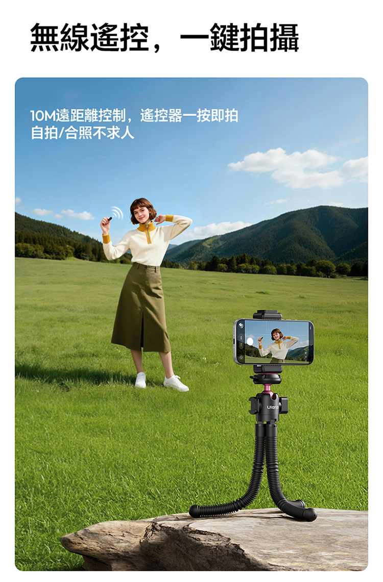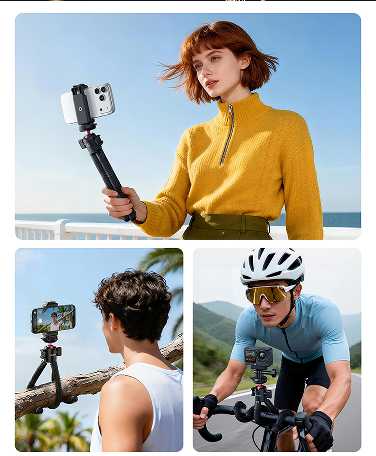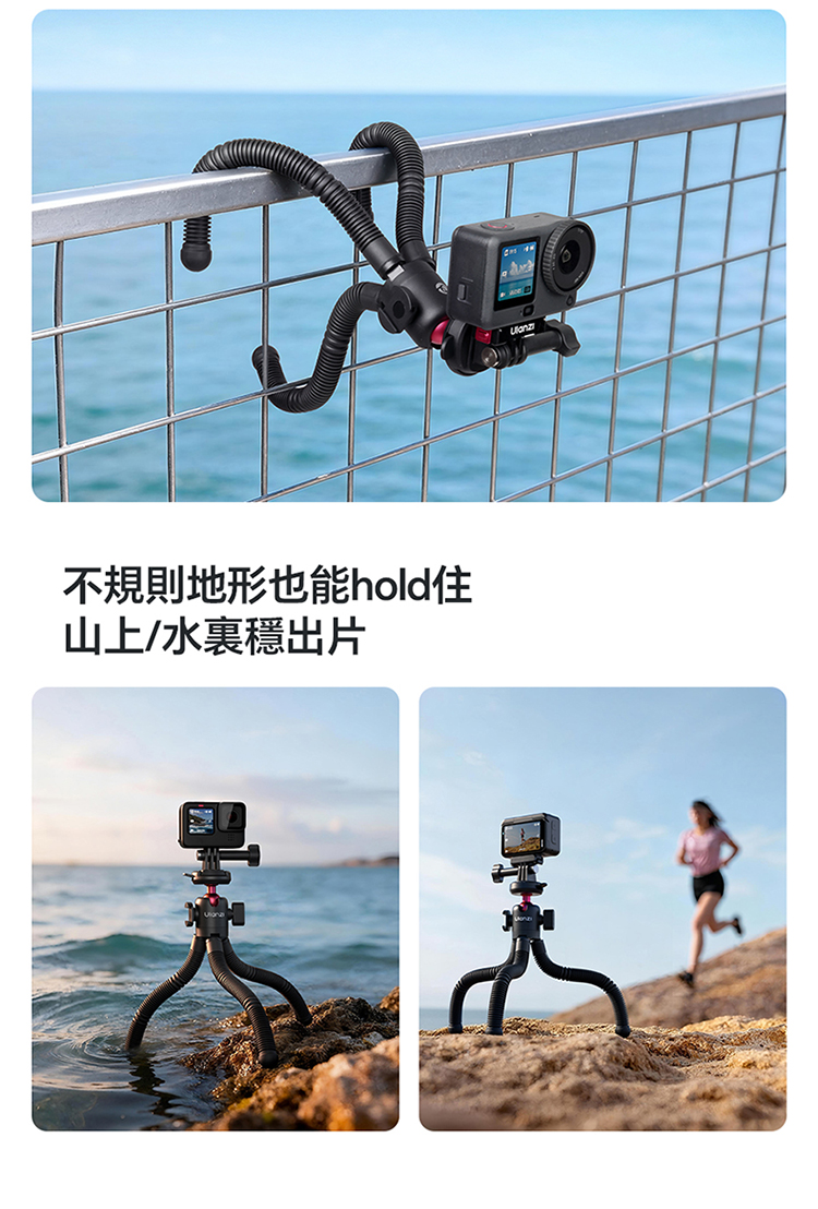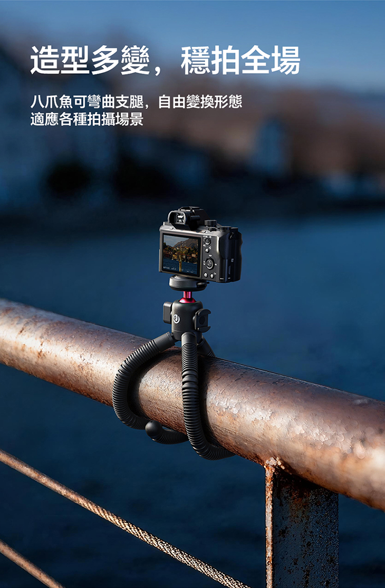 • 八爪魚柔性腳架,造型多變:可彎曲腳架設計,自由變換造型,桌面、欄杆、樹枝等場景皆可穩定固定
