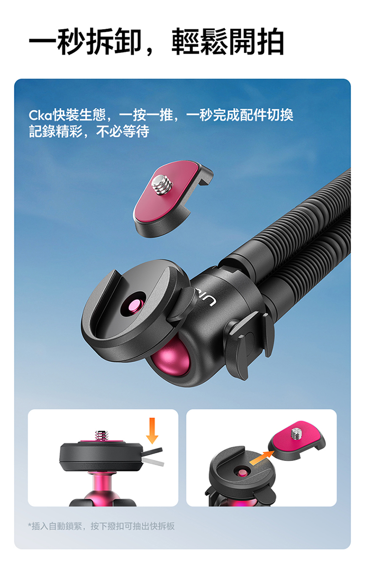 • CKA 快裝生態,一秒安裝:一按一推即可完成安裝與拆卸,快速切換設備,不錯過任何拍攝時機