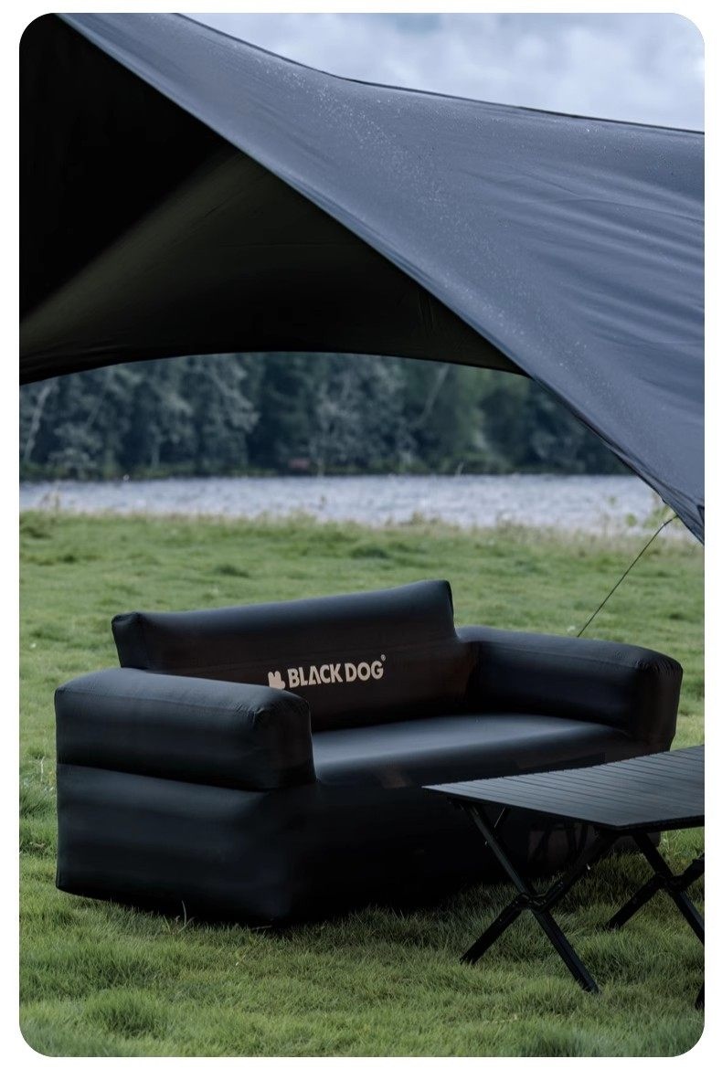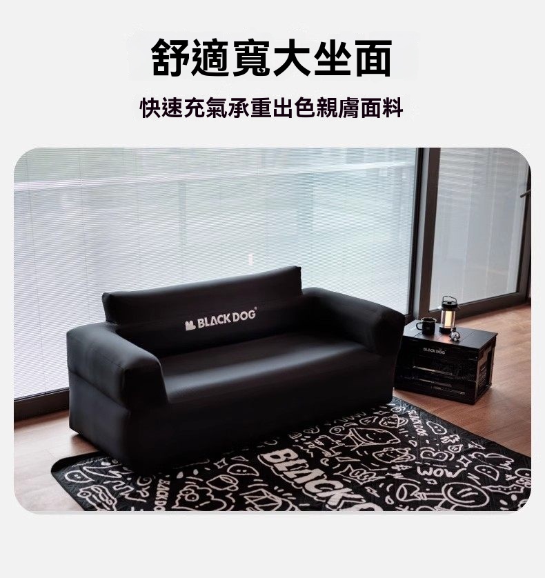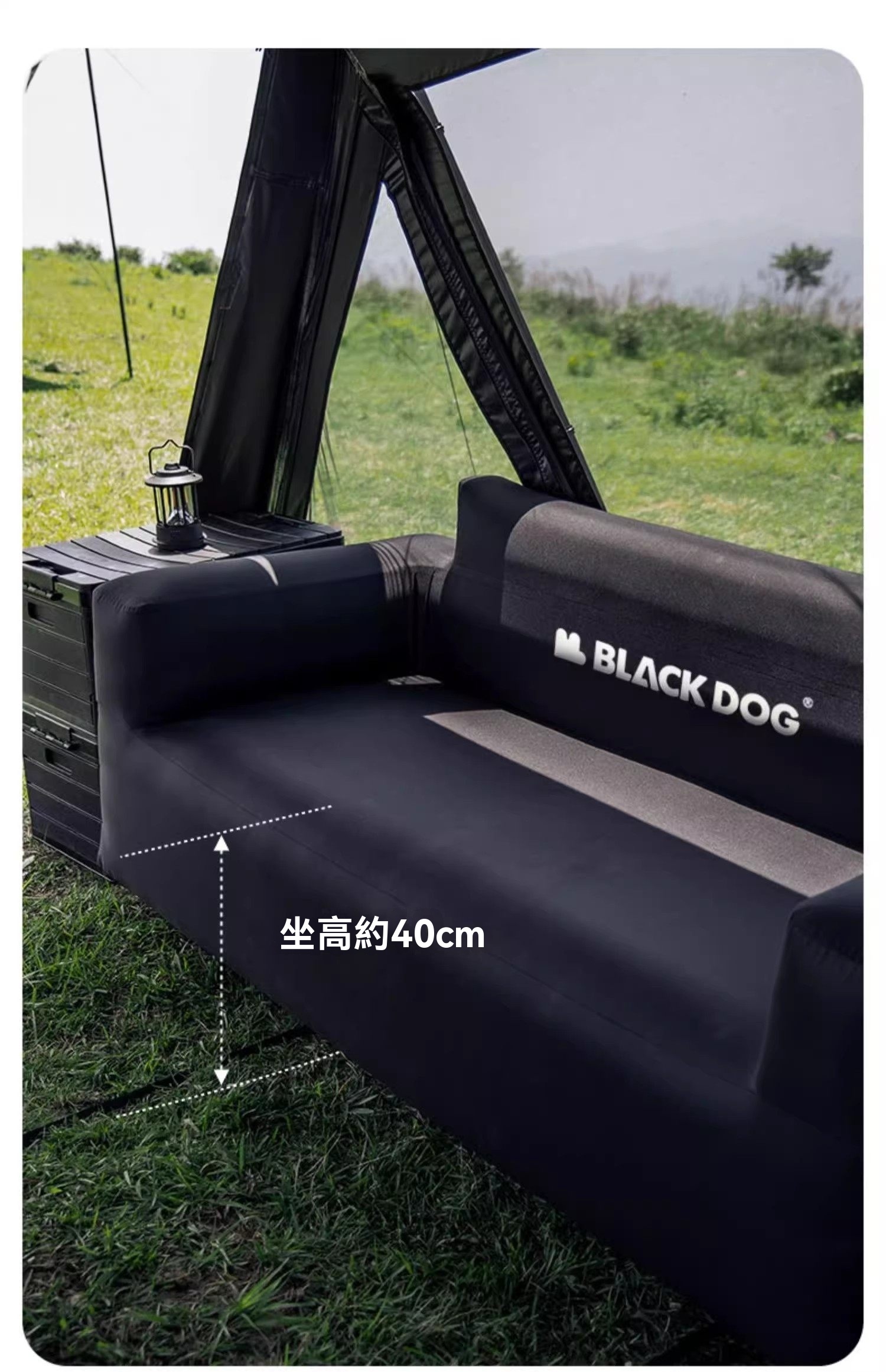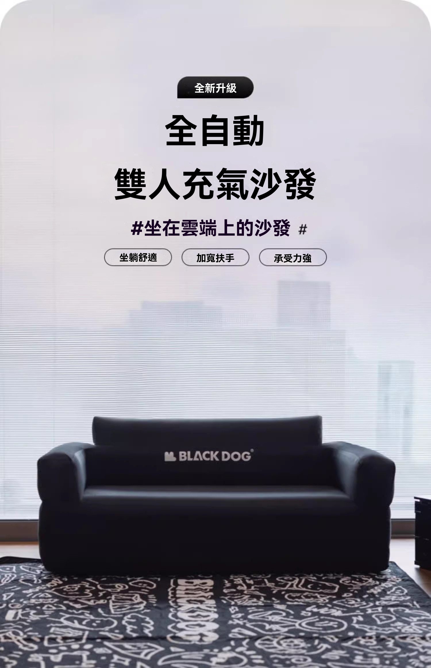 Blackdog 黑狗雙人充氣沙發床是一款專為戶外休閒設計的便攜式家具。其最大亮點是內建了全自動充氣泵,僅需約2分鐘即可快速充滿氣體,省時省力。沙發床採用堅固耐用的300D防潑水牛津布製成,抗污耐磨。通過獨特的“多點支撐”結構和上下獨立的氣室設計,它能分散壓力,提供穩固支撐,並有效防止漏氣,承重可高達300公斤。沙發坐高約40-45厘米,可隔離地面濕氣與寒冷,提供舒適的坐臥體驗。其雙人款展開尺寸約為172x84厘米,收納後體積小巧,非常適合露營、野餐或居家使用。