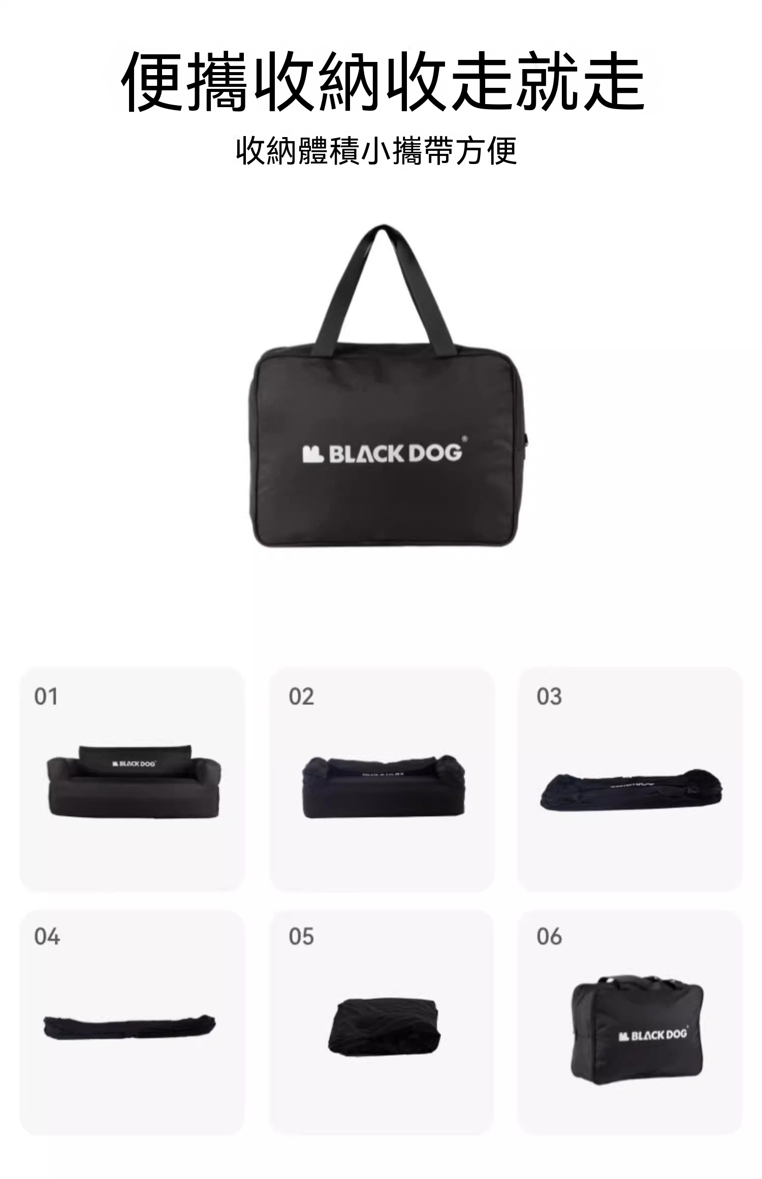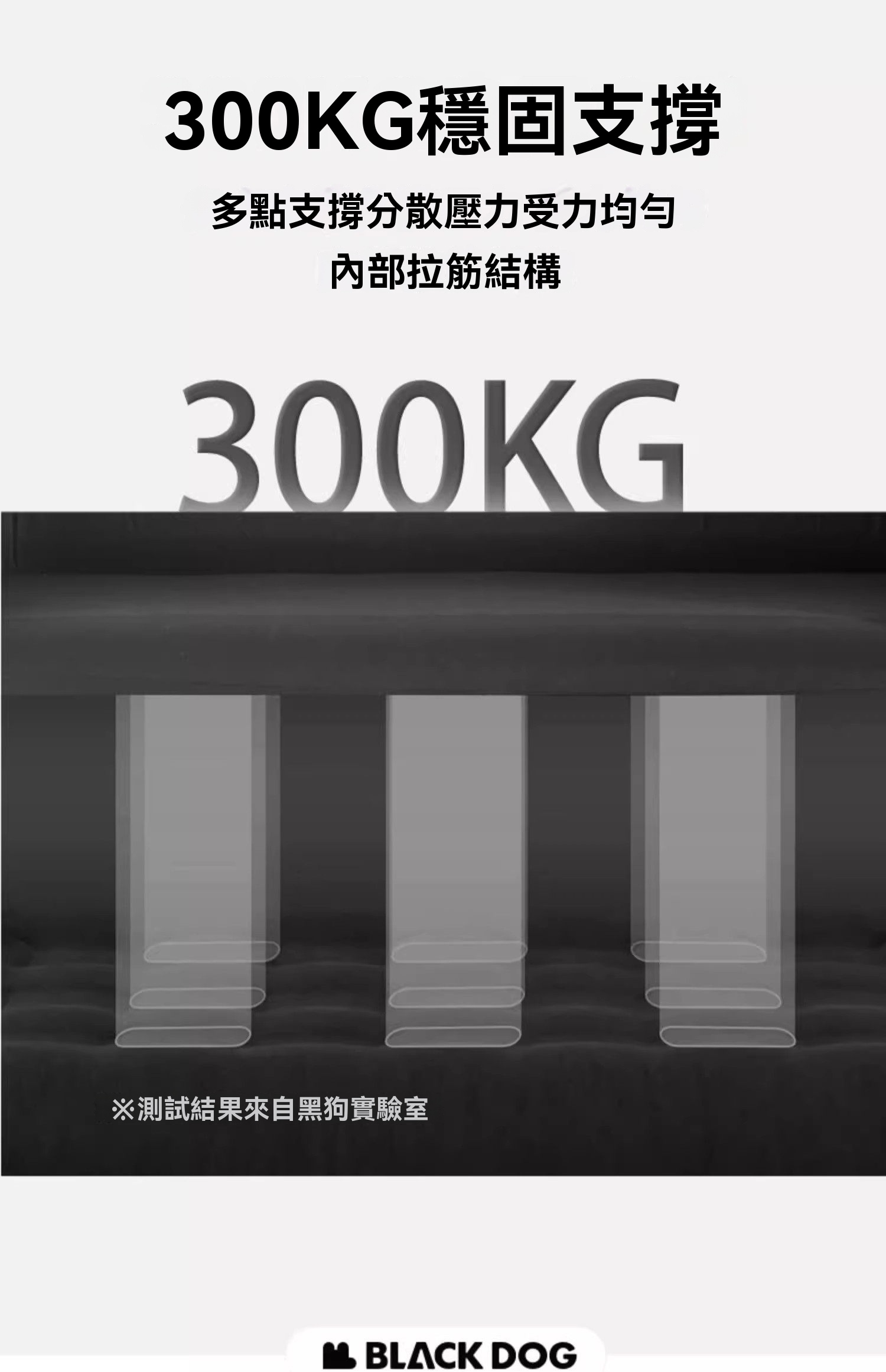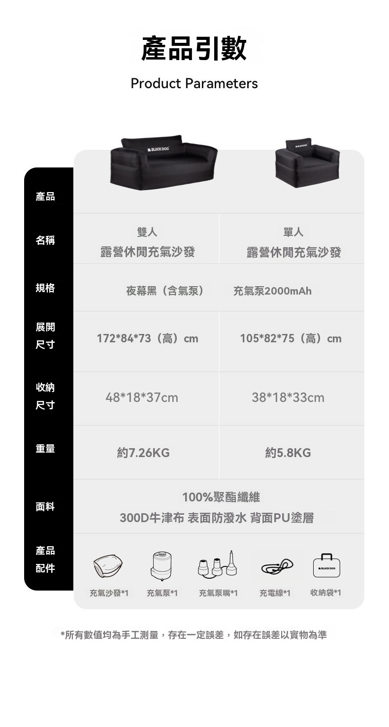 Blackdog 黑狗雙人充氣沙發床是一款專為戶外休閒設計的便攜式家具。其最大亮點是內建了全自動充氣泵,僅需約2分鐘即可快速充滿氣體,省時省力。沙發床採用堅固耐用的300D防潑水牛津布製成,抗污耐磨。通過獨特的“多點支撐”結構和上下獨立的氣室設計,它能分散壓力,提供穩固支撐,並有效防止漏氣,承重可高達300公斤。沙發坐高約40-45厘米,可隔離地面濕氣與寒冷,提供舒適的坐臥體驗。其雙人款展開尺寸約為172x84厘米,收納後體積小巧,非常適合露營、野餐或居家使用。