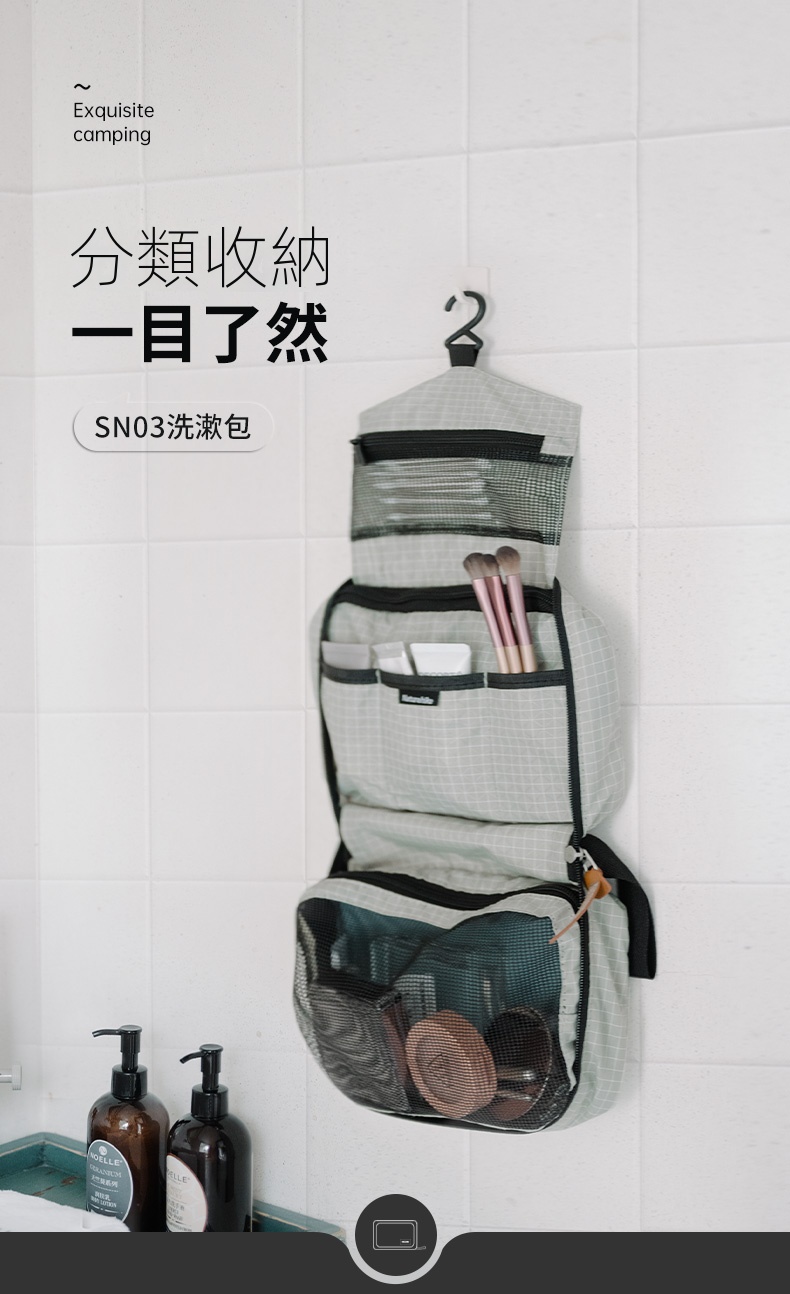 NatureHike SN03 旅行洗漱包,材質為100%聚醯胺纖維及PVC網布,輕巧便攜。獨特的透視小口袋和豎插式設計,讓小物件分類收納一目了然,拿取更方便。半透主倉可容納大瓶洗護用品,PVC防水內袋則確保濕物獨立存放,避免滲漏。加寬手提織帶設計,可拎可掛,舒適不勒手。這款洗漱包讓您的出行更加有條不紊、井然有序。