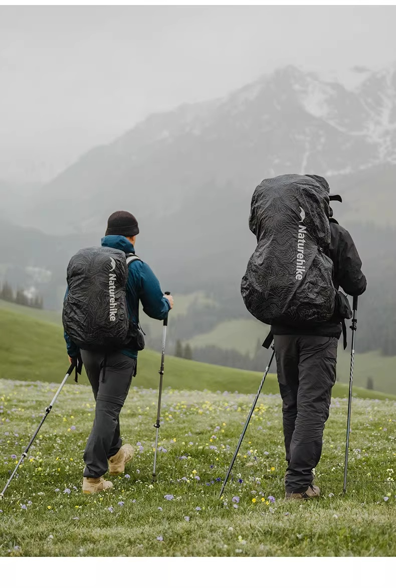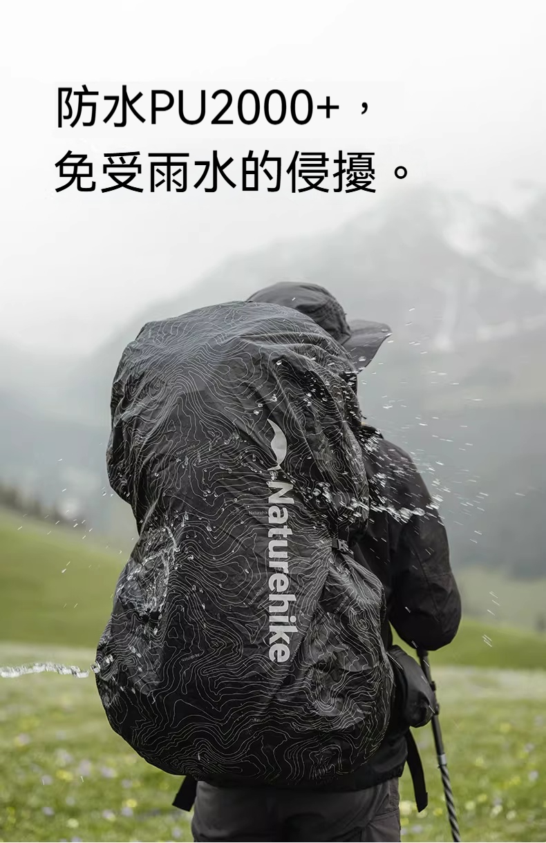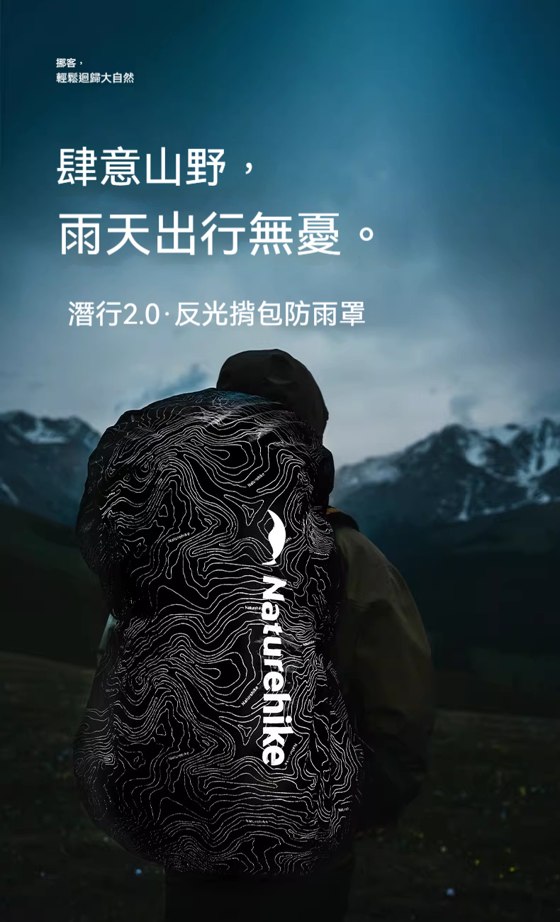 Naturehike 潛行2.0 · 雙肩包反光防雨保護套,採用防水PU2000+塗層,有效抵禦雨水侵襲,確保戶外雨天出行時揹包內物品乾爽。罩體配有大幅夜間反光標誌,顯著提升昏暗環境下的行走安全性。產品提供兩種規格,可適配不同尺寸揹包,且收納後體積小巧輕便,可輕鬆放入口袋,是您山野探索或都市通勤的實用防護配件。