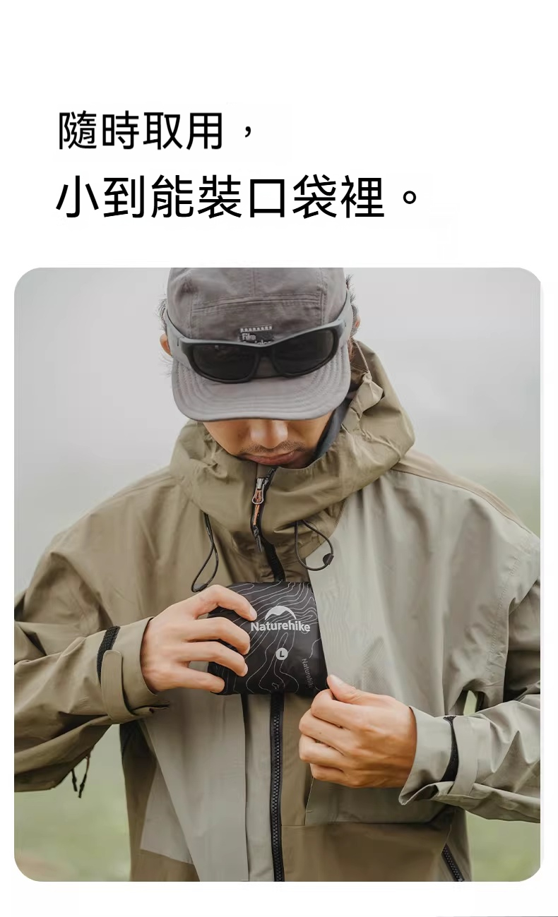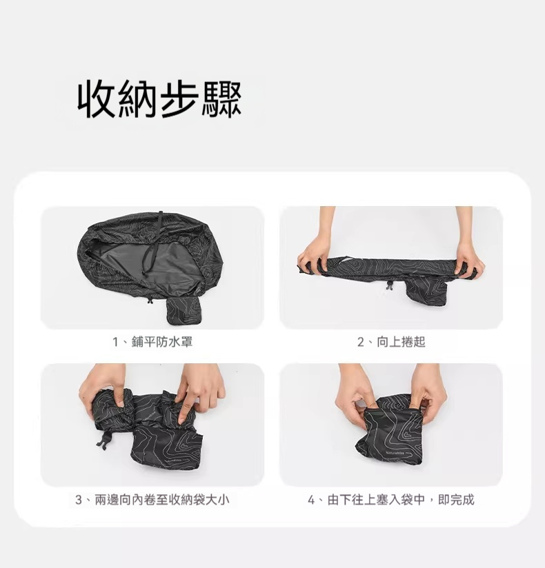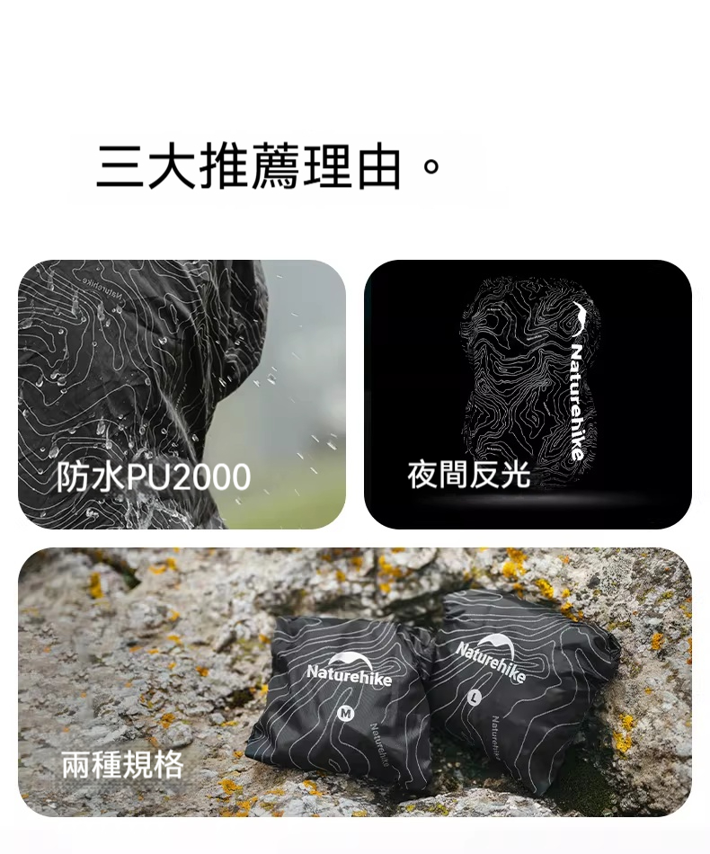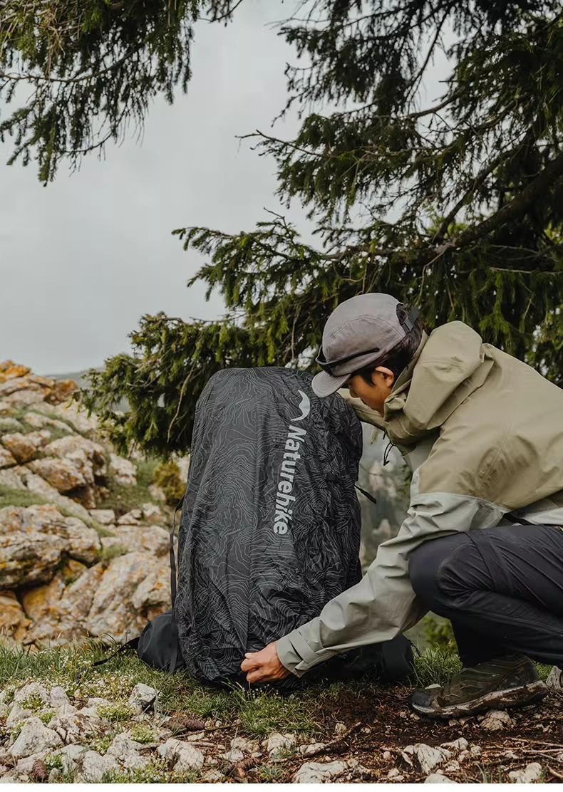 Naturehike 潛行2.0 · 雙肩包反光防雨保護套,採用防水PU2000+塗層,有效抵禦雨水侵襲,確保戶外雨天出行時揹包內物品乾爽。罩體配有大幅夜間反光標誌,顯著提升昏暗環境下的行走安全性。產品提供兩種規格,可適配不同尺寸揹包,且收納後體積小巧輕便,可輕鬆放入口袋,是您山野探索或都市通勤的實用防護配件。