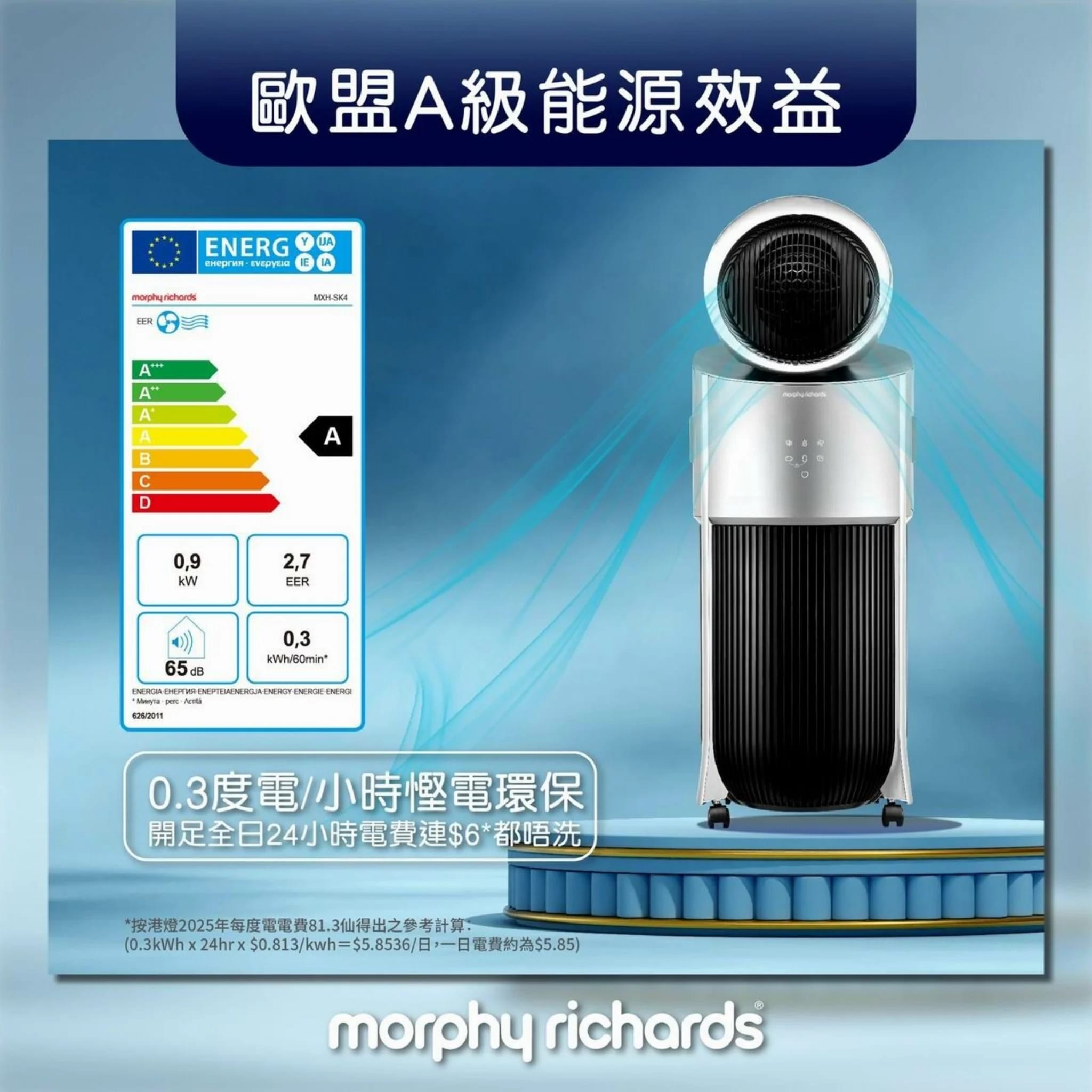 • 慳電 – 歐盟A級能源標籤 每小時只需0.3度電