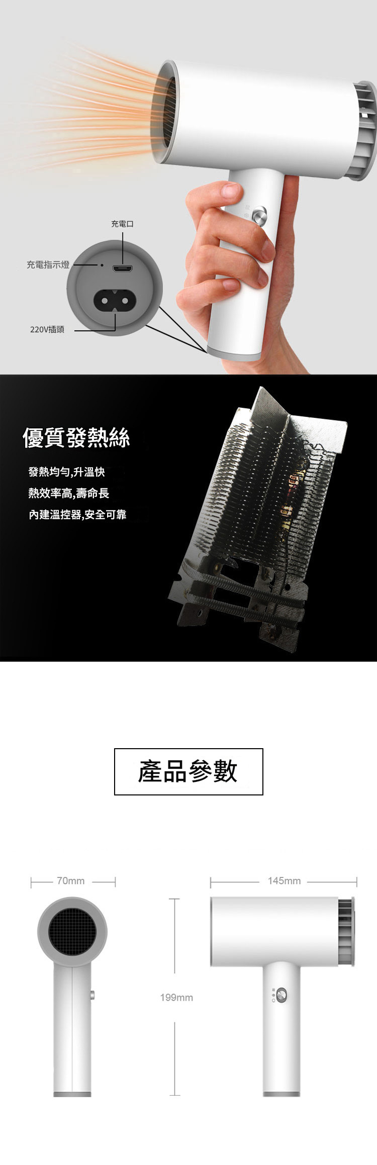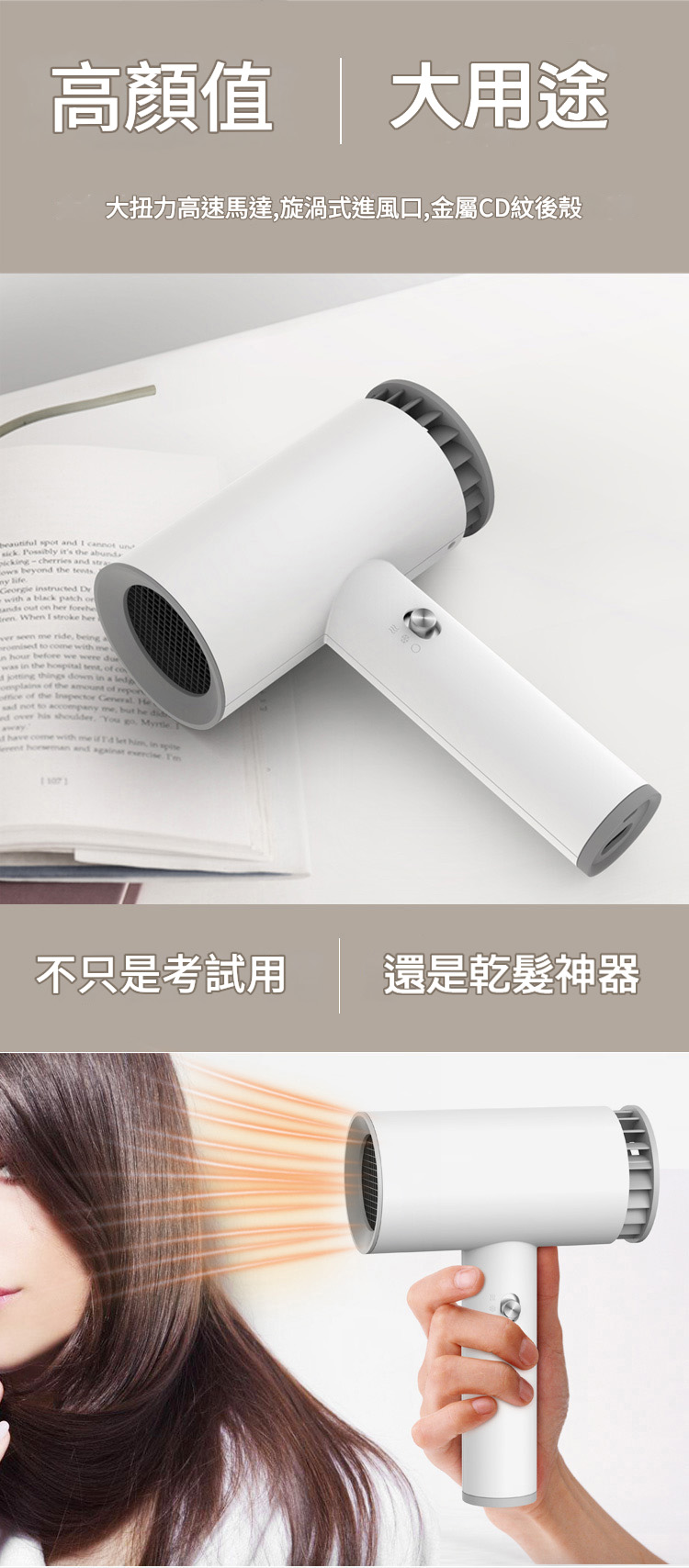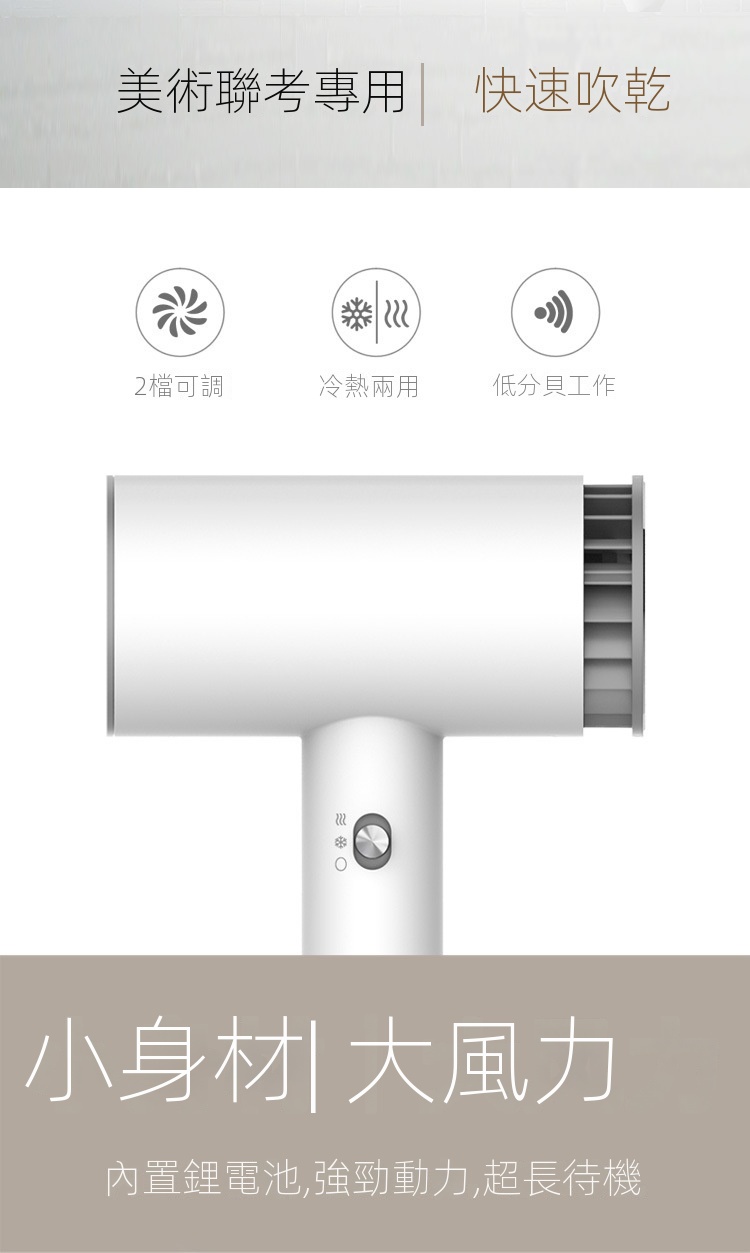 便攜式無線吹風機,插電熱風與充電冷風兩用設計,滿足多種需求。採用2600mAh鋰電池,續航40-50分鐘,充滿電僅需4小時。具備兩檔可調風速,低分貝運行,使用更舒適。小巧體積,大風力,內置強勁馬達,快速吹乾頭髮或物品。適用於美術考試、家居及辦公場景,是您理想的吹乾神器。