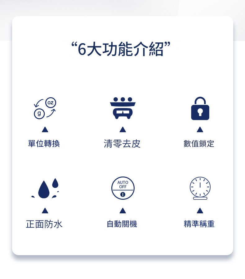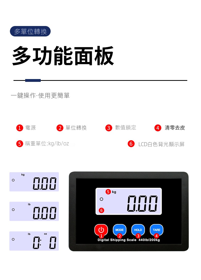 • 支援單位轉換、清零去皮、數值鎖定等六大功能