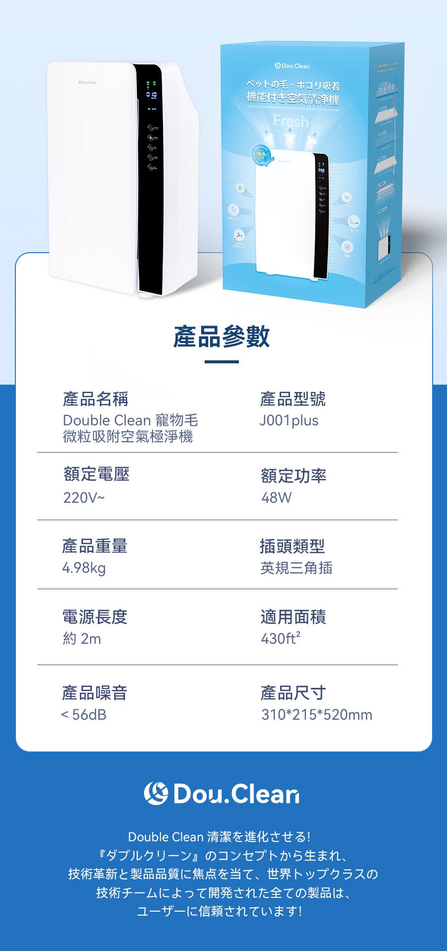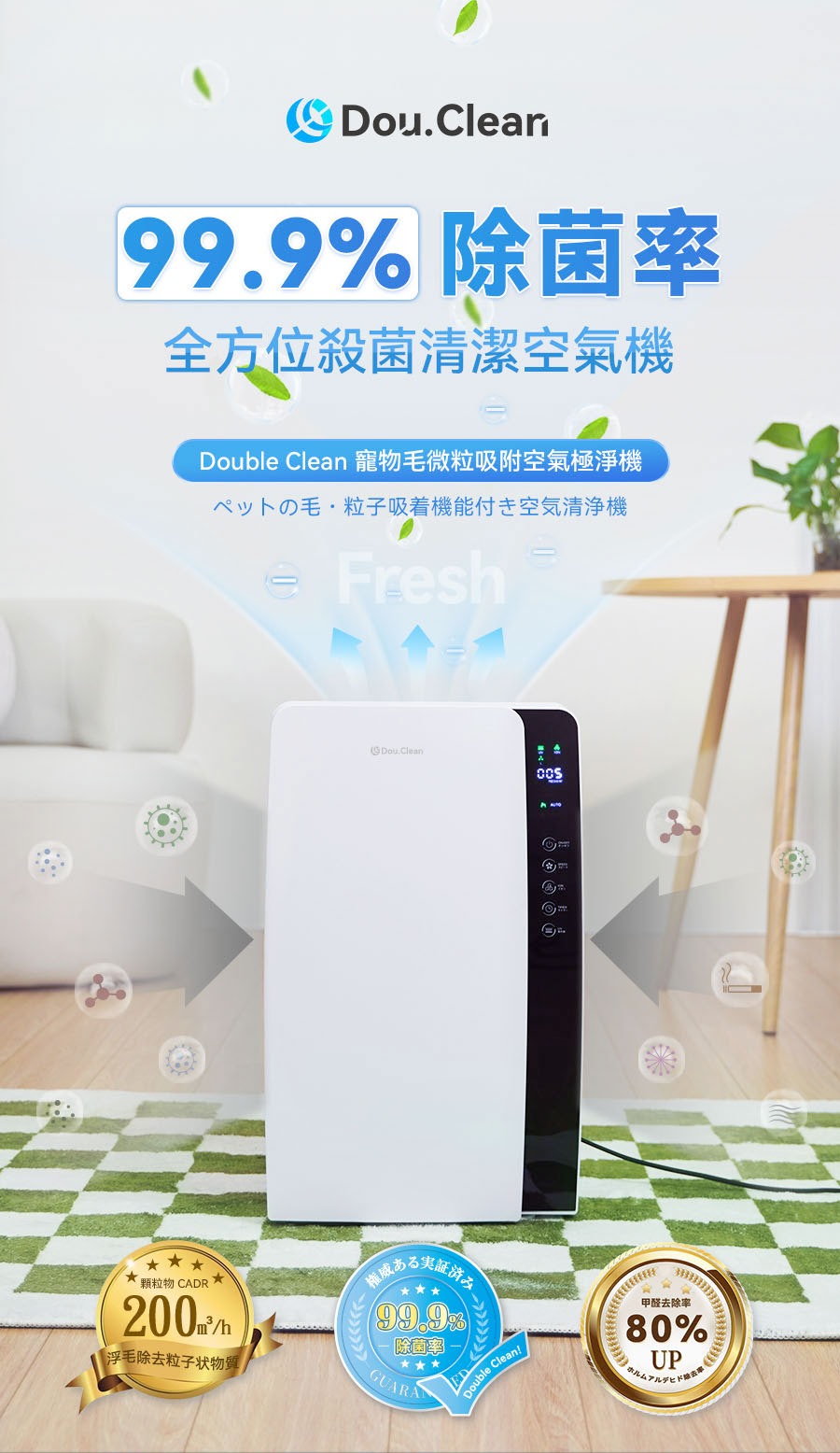 Double Clean 寵物毛微粒吸附空氣極淨機(型號 J001 plus,外觀為白色),吸力與淨化能力出色,10 倍吸力可吸走空中飄浮寵物毛髮,無需手動清潔;10 倍淨化力去除煙味、寵物毛髮、粉塵、甲醛,還可全 “菌” 覆沒,更能去除煙味、寵物毛髮、粉塵、甲醛,還可全 “菌” 覆沒,更能去除花粉,對空氣中 0.39%。它採用四層濾網(含 HEPA 濾網),搭配 UVC + 光觸媒 + 負離子的 4D 滅菌系統與光觸媒除臭濾網,能全效淨化空氣顆粒物、滅殺細菌並去除異味;配備實時感測功能,可數字化顯示 PM2.5 數值,助力改善空氣質量,適用面積 60 平方米。產品支援三檔調速(低速 550 轉 / 分鐘、高速 1050 轉 / 分鐘),可根據空氣品質自動或手動調整風力,還擁有 360° 過濾循環設計與 1-24 小時定時模式,淨化風可覆蓋全屋。