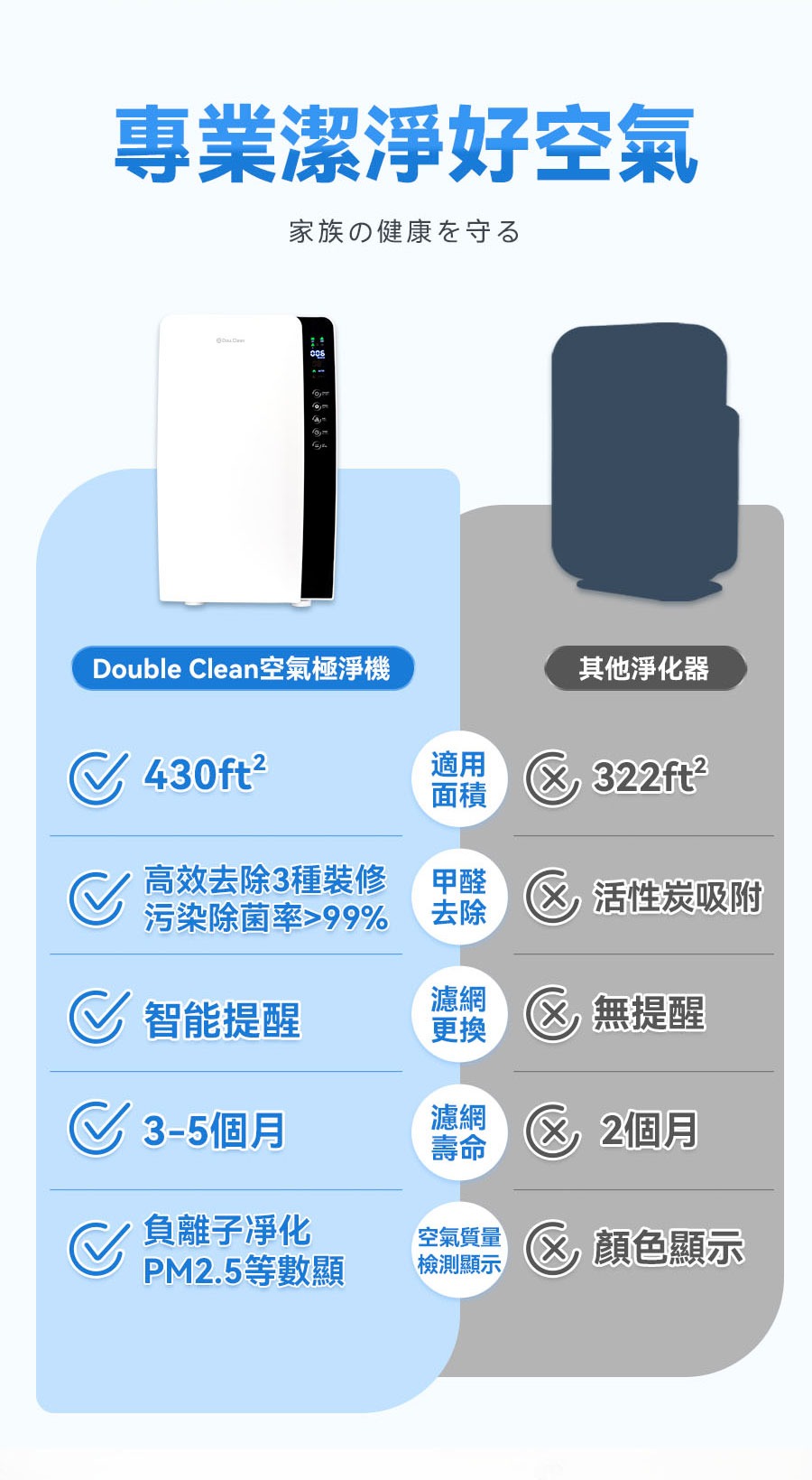 • 濾網壽命:3-5個月(累計工作時間達到3000個小時,機器會自動提醒更換濾網)