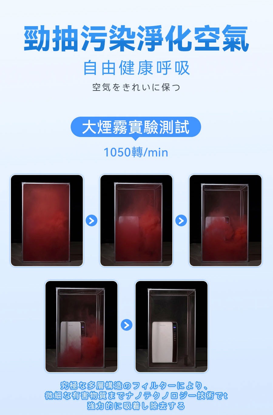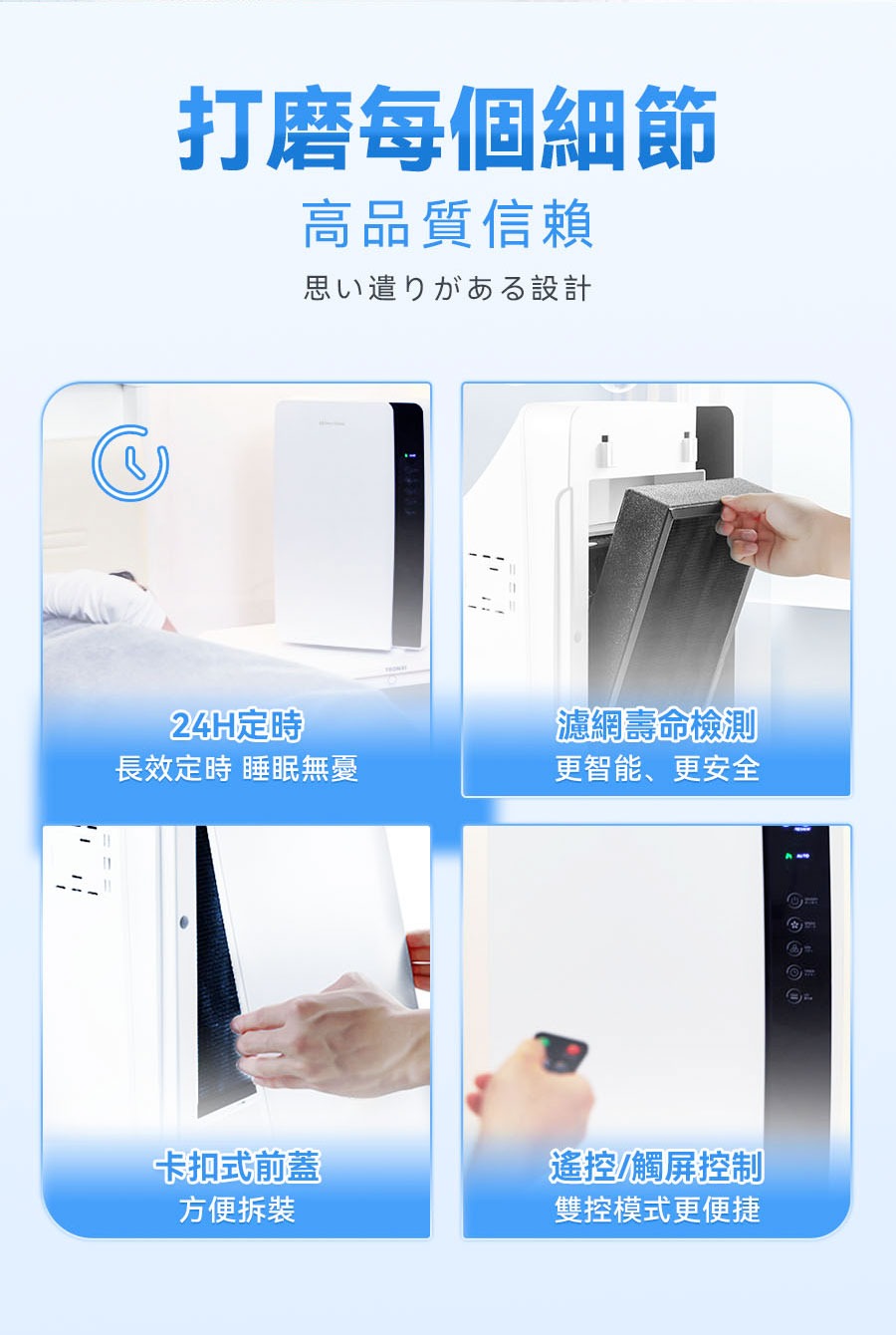 • 濾網:四層複合濾網(初濾網+蜂窩活性炭+HEPA+光觸媒)