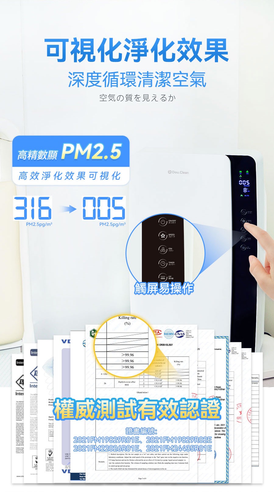 • 四層漸進式濾網,去除空氣中99.97%小至0.3微米的顆粒物