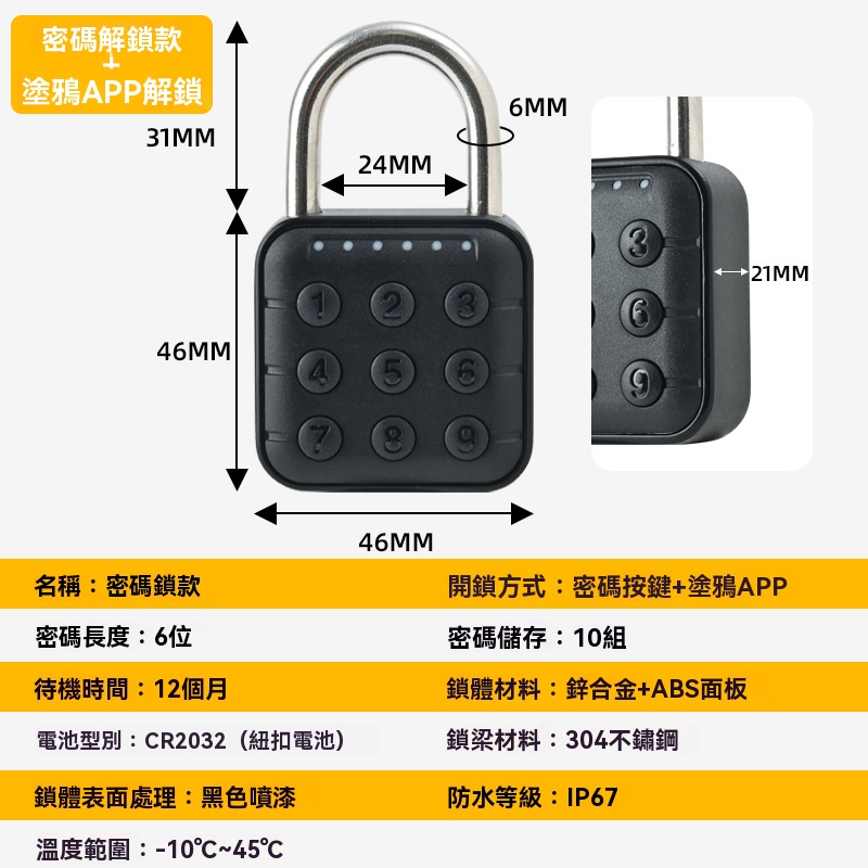 • 開鎖方式:密碼按鍵+塗鴉APP