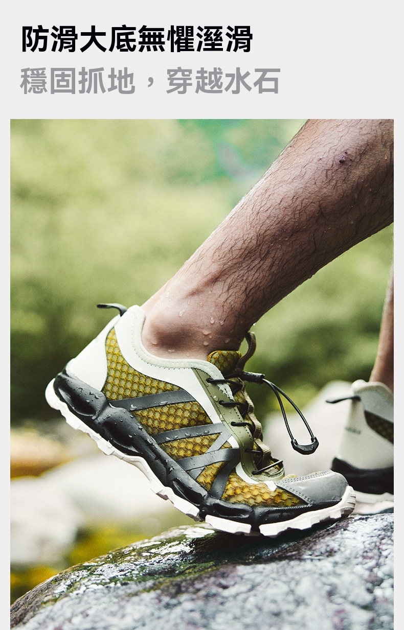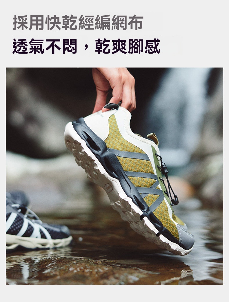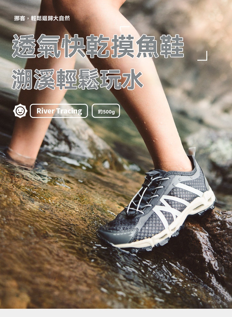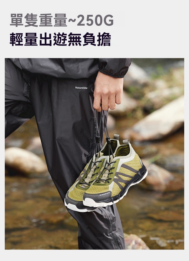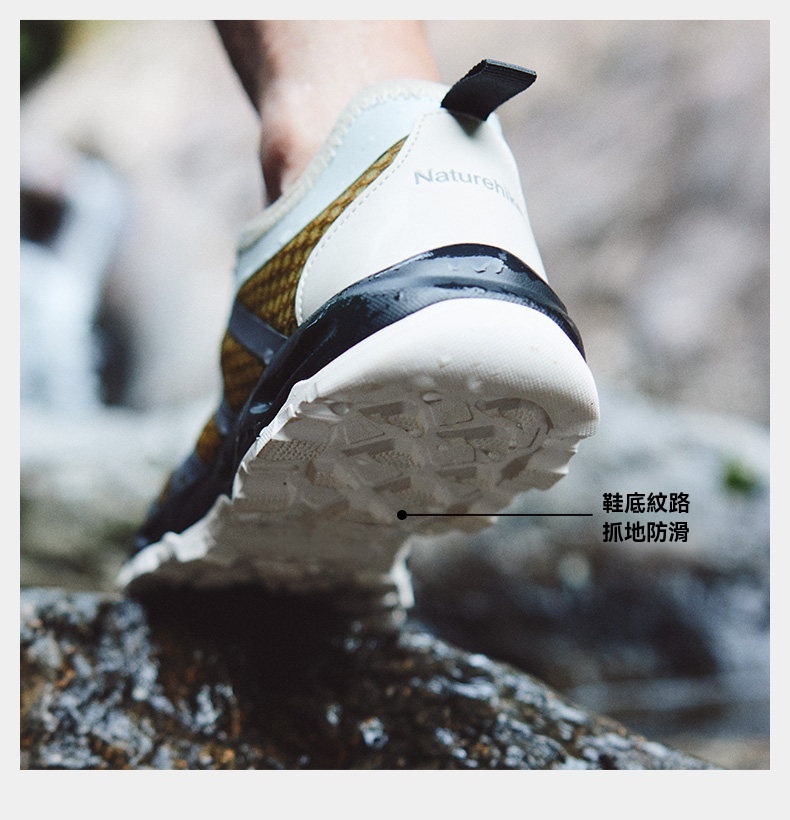 Naturehike 輕量化水陸兩棲專業溯溪鞋專為親水戶外場景設計,以「輕量化、快乾、防滑」為核心。鞋身採用快乾經編網布,配合中底兩側排水結構,迅速排走水分,保持雙腳乾爽透氣。防滑大底提供濕地可靠抓地力,搭配輕量設計,讓你在溯溪、釣魚、健行等多種場景中自如行動,輕鬆回歸自然。