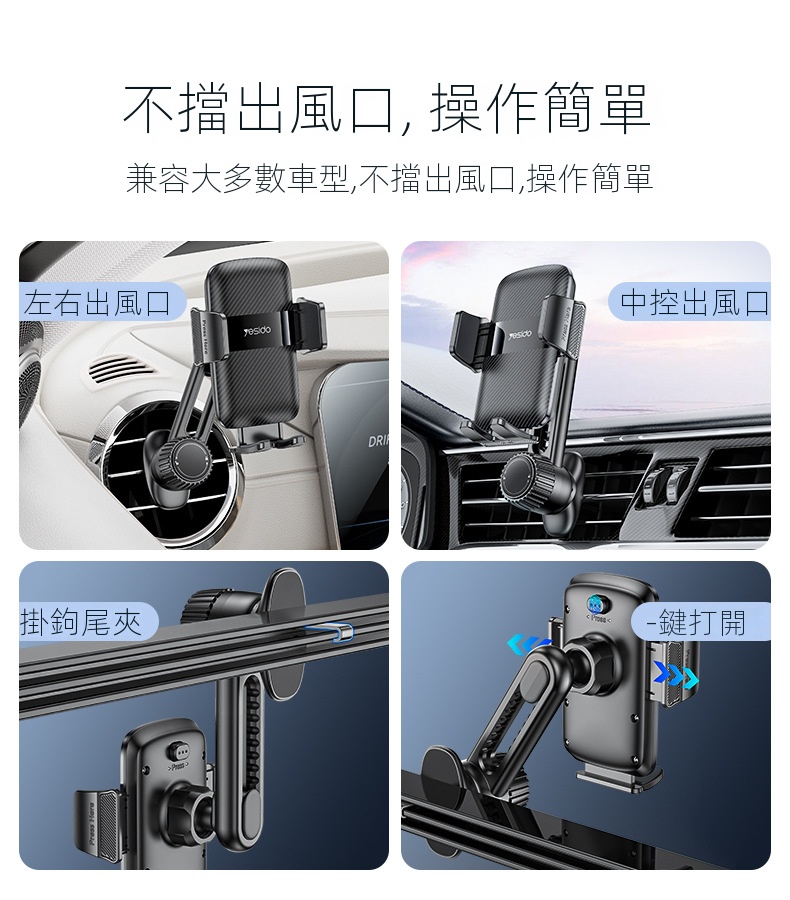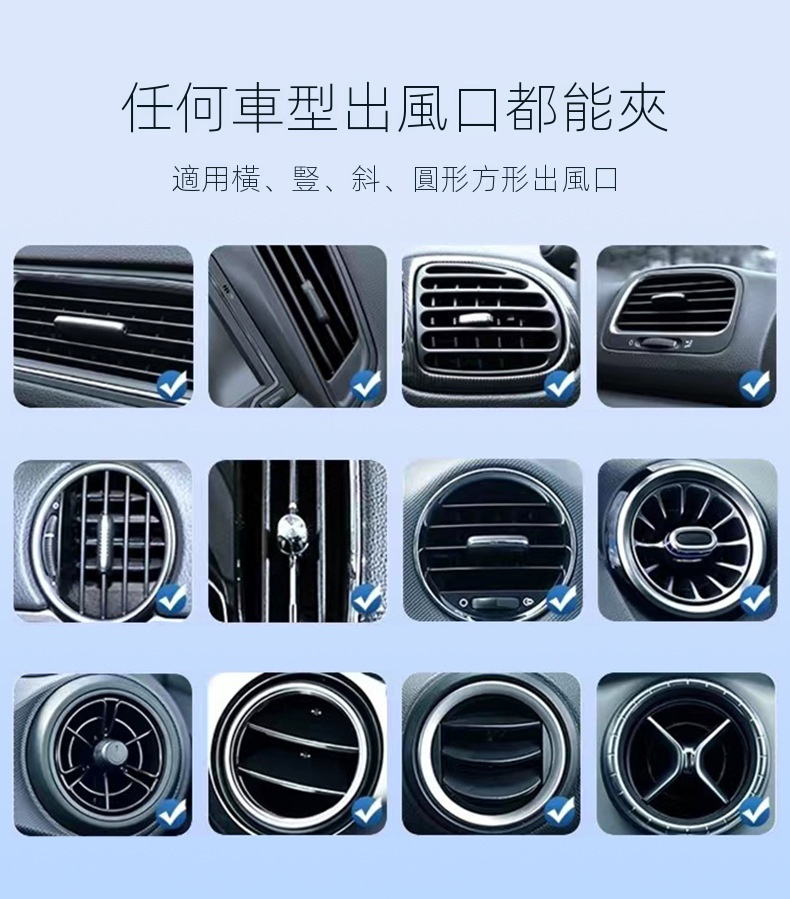 • 不擋出風口,操作簡單,兼容大多數車型,適用於左右出風口及中控出風口。