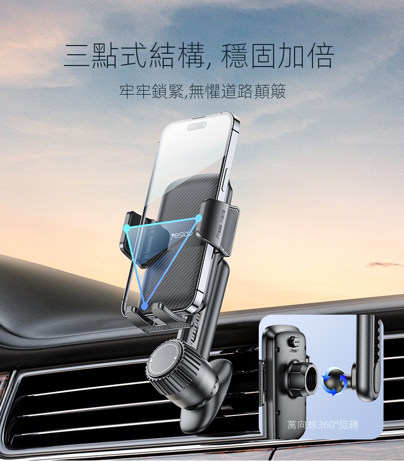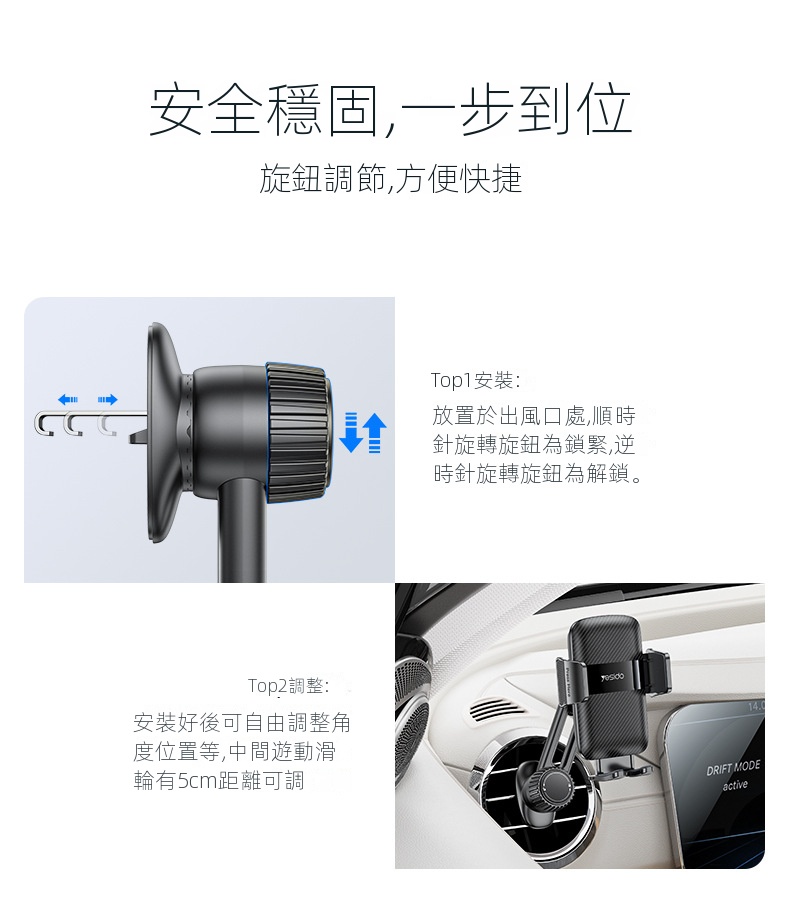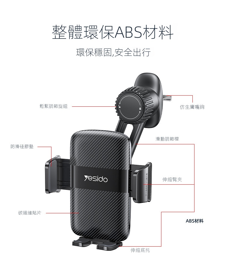 • Resido易豆車載出風口支架,採用可調節螺母式伸縮鷹嘴倒扣設計,適合任意車型。