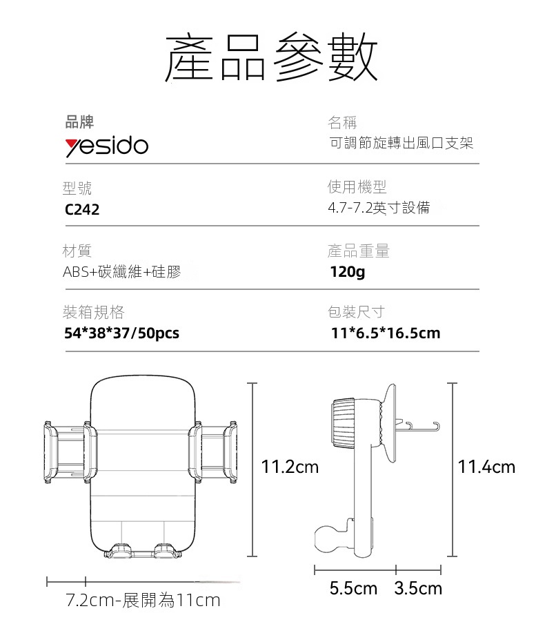 C242 車用出風口手機支架採用仿生鷹嘴倒鉤設計,適用於各種車型的橫、豎、圓形或方形出風口。三點式固定結構搭配旋鈕調節,穩固不擋風,無懼道路顛簸。萬向球360°旋轉,多角度自由調整,滿足不同需求。用於駕駛者導航,接聽電話及播放音樂等等用途。